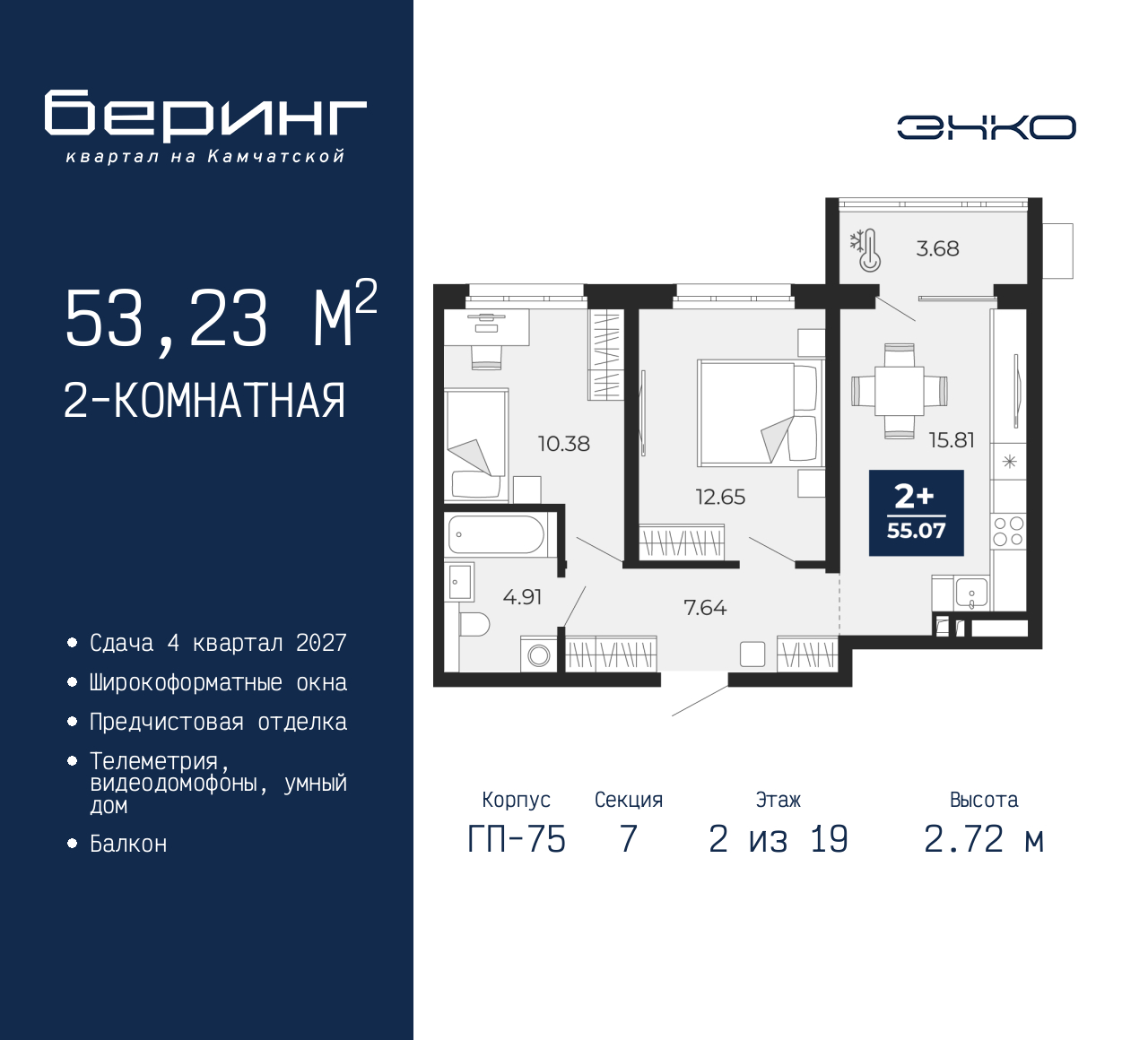 Продается 2-комн. квартира с предчистовой отделкой в ЖК "Беринг" на 2 этаже. Общая площадь: 53.23 кв.м., жилая: 23.03 кв.м., площадь просторной кухни-столовой: 15.81 кв.м. Комнаты изолированные, все окна выходят на одну сторону. В квартире один балкон, один совмещенный санузел. Высота потолков 2.72 м. Дом монолитный, многоподъездный, переменной этажности, от 17 до 24 этажей. Квартира находится в 7-й секции высотой 19 этажей в корпусе ГП-75. На этаже 7 квартир. В подъезде 2 пассажирских и 1 грузовой лифт. Окончание строительства - 4 квартал 2027 года. Оформление сделки по договору долевого участия. Подобно знаменитому исследователю, мы чувствуем себя первооткрывателями этой локации. Хотим показать новую суть места, сформировать для вас жизненный опыт, которого ещё не было. Беринг — район зелёного цвета. Беринг — район, который откроется вам с другой стороны. Впечатлит новым уровнем комфорта и качеством жизни. Беринг — открытие на карте города. Первый квартал расположен в районе Тура, в границах улиц: Камчатская – Западносибирская – Энтузиастов. Вокруг уже есть всё для того, чтобы ежедневная рутина была лишь частью жизни и не доставляла дискомфорта. Школы и детские сады, магазины и аптеки, поликлиника, места для семейного отдыха, пеших и велопрогулок, и даже рыбалки. Масштабное озеленение дворов — визитная карточка ЭНКО и ваш оазис спокойствия, чтобы отвлечься от повседневности. Раскидистые деревья, кустарники, травы и цветы — осталось остановиться, вдохнуть и расслабиться, глядя на эту природную красоту. Стилистика подъездов продолжает концепцию Беринга, вдохновлённого Камчаткой: сдержанный, но при этом впечатляющий дизайн соседствует с удобством и функциональностью. (AQID02529655)