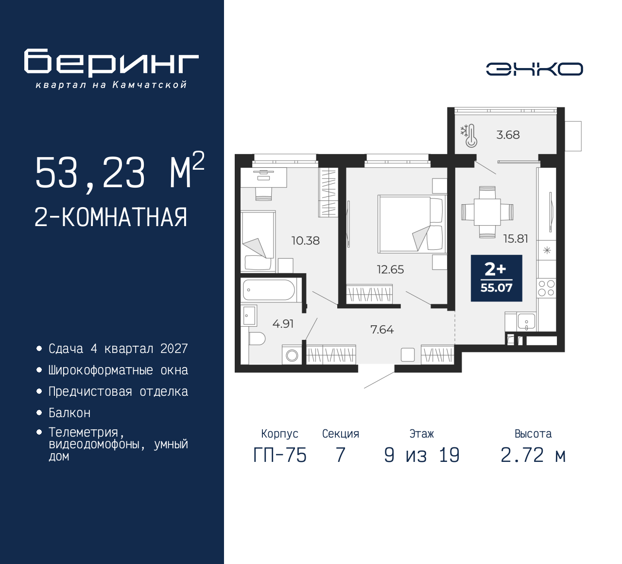 Двухкомнатная квартира с предчистовой отделкой в ЖК "Беринг" на 9 этаже. Общая площадь: 53.23 кв.м., жилая: 23.03 кв.м., площадь просторной кухни-столовой: 15.81 кв.м. Комнаты изолированные, все окна выходят на одну сторону. В квартире один балкон, один совмещенный санузел. Высота потолков 2.72 м. Дом монолитный, многоподъездный, переменной этажности, от 17 до 24 этажей. Квартира находится в 7-й секции высотой 19 этажей в корпусе ГП-75. На этаже 7 квартир. В подъезде 2 пассажирских и 1 грузовой лифт. Окончание строительства - 4 квартал 2027 года. Оформление сделки по договору долевого участия. Подобно знаменитому исследователю, мы чувствуем себя первооткрывателями этой локации. Хотим показать новую суть места, сформировать для вас жизненный опыт, которого ещё не было. Беринг — район зелёного цвета. Беринг — район, который откроется вам с другой стороны. Впечатлит новым уровнем комфорта и качеством жизни. Беринг — открытие на карте города. Первый квартал расположен в районе Тура, в границах улиц: Камчатская – Западносибирская – Энтузиастов. Вокруг уже есть всё для того, чтобы ежедневная рутина была лишь частью жизни и не доставляла дискомфорта. Школы и детские сады, магазины и аптеки, поликлиника, места для семейного отдыха, пеших и велопрогулок, и даже рыбалки. Масштабное озеленение дворов — визитная карточка ЭНКО и ваш оазис спокойствия, чтобы отвлечься от повседневности. Раскидистые деревья, кустарники, травы и цветы — осталось остановиться, вдохнуть и расслабиться, глядя на эту природную красоту. Стилистика подъездов продолжает концепцию Беринга, вдохновлённого Камчаткой: сдержанный, но при этом впечатляющий дизайн соседствует с удобством и функциональностью. (AQID02529662)