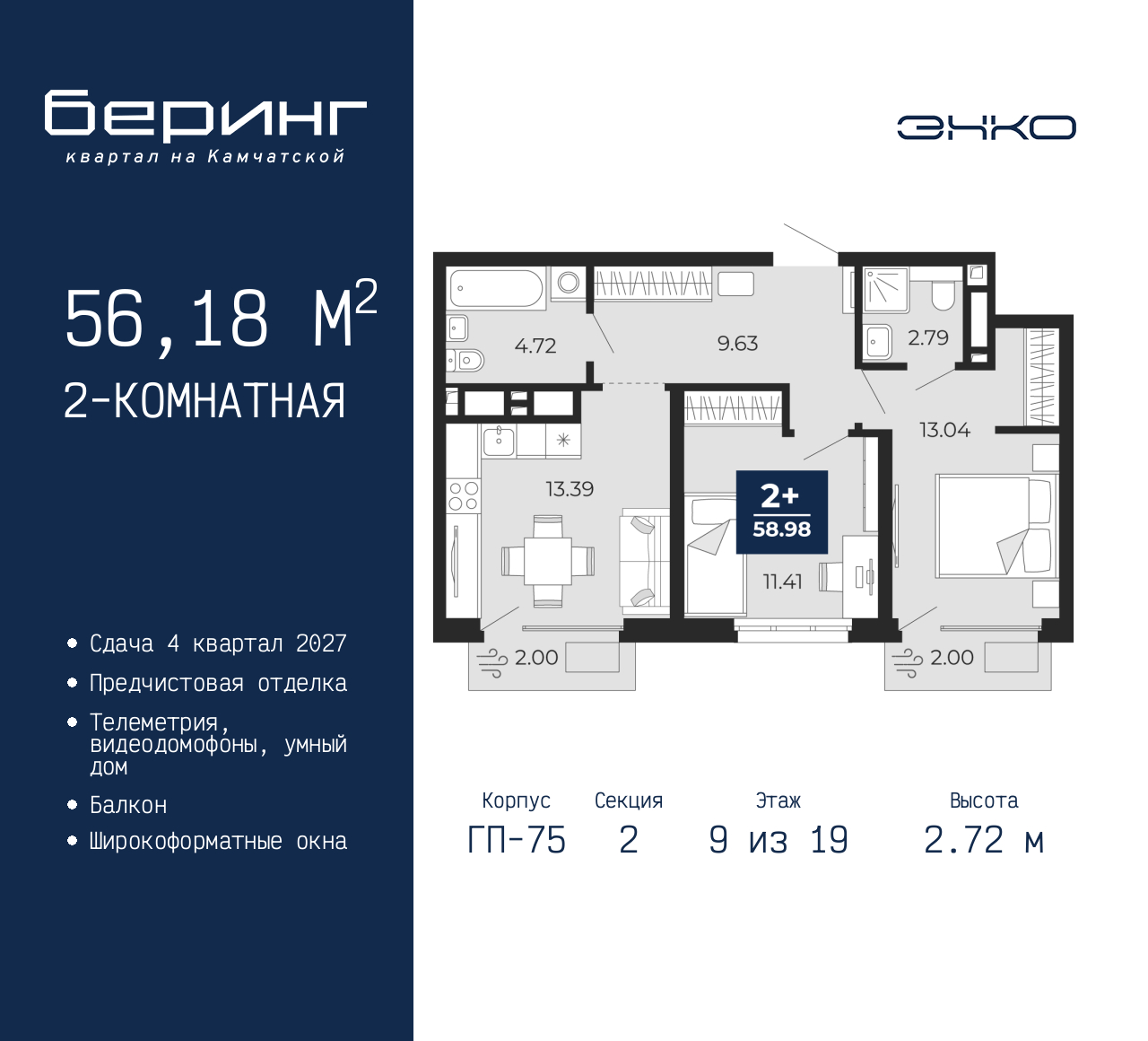 Продается двухкомнатная квартира с предчистовой отделкой в ЖК "Беринг" на 9 этаже. Общая площадь: 56.18 кв.м., жилая: 24.45 кв.м., площадь просторной кухни-столовой: 13.39 кв.м. Комнаты изолированные, все окна выходят на одну сторону. В квартире два балкона, два совмещенных санузла. Высота потолков 2.72 м. Дом монолитный, многоподъездный, переменной этажности, от 17 до 24 этажей. Квартира находится во 2-й секции высотой 19 этажей в корпусе ГП-75. На этаже 7 квартир. В подъезде 2 пассажирских и 1 грузовой лифт. Окончание строительства - 4 квартал 2027 года. Оформление сделки по договору долевого участия. Подобно знаменитому исследователю, мы чувствуем себя первооткрывателями этой локации. Хотим показать новую суть места, сформировать для вас жизненный опыт, которого ещё не было. Беринг — район зелёного цвета. Беринг — район, который откроется вам с другой стороны. Впечатлит новым уровнем комфорта и качеством жизни. Беринг — открытие на карте города. Первый квартал расположен в районе Тура, в границах улиц: Камчатская – Западносибирская – Энтузиастов. Вокруг уже есть всё для того, чтобы ежедневная рутина была лишь частью жизни и не доставляла дискомфорта. Школы и детские сады, магазины и аптеки, поликлиника, места для семейного отдыха, пеших и велопрогулок, и даже рыбалки. Масштабное озеленение дворов — визитная карточка ЭНКО и ваш оазис спокойствия, чтобы отвлечься от повседневности. Раскидистые деревья, кустарники, травы и цветы — осталось остановиться, вдохнуть и расслабиться, глядя на эту природную красоту. Стилистика подъездов продолжает концепцию Беринга, вдохновлённого Камчаткой: сдержанный, но при этом впечатляющий дизайн соседствует с удобством и функциональностью. (AQID02529697)