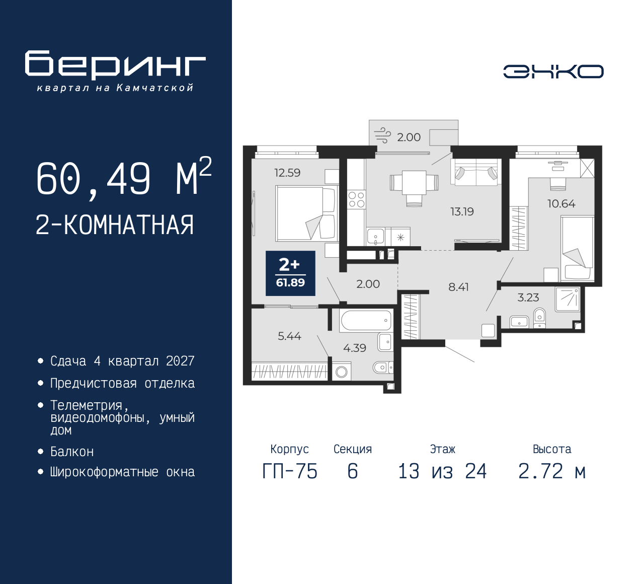 Просторная 2-комн. квартира с предчистовой отделкой в ЖК "Беринг" на 13 этаже. Общая площадь: 60.49 кв.м., жилая: 23.23 кв.м., площадь просторной кухни-столовой: 13.19 кв.м. Комнаты изолированные, все окна выходят на одну сторону. В квартире один балкон, два совмещенных санузла. Высота потолков 2.72 м. Дом монолитный, многоподъездный, переменной этажности, от 17 до 24 этажей. Квартира находится в 6-й секции высотой 24 этажа в корпусе ГП-75. На этаже 6 квартир. В подъезде 2 пассажирских и 1 грузовой лифт. Окончание строительства - 4 квартал 2027 года. Оформление сделки по договору долевого участия. Подобно знаменитому исследователю, мы чувствуем себя первооткрывателями этой локации. Хотим показать новую суть места, сформировать для вас жизненный опыт, которого ещё не было. Беринг — район зелёного цвета. Беринг — район, который откроется вам с другой стороны. Впечатлит новым уровнем комфорта и качеством жизни. Беринг — открытие на карте города. Первый квартал расположен в районе Тура, в границах улиц: Камчатская – Западносибирская – Энтузиастов. Вокруг уже есть всё для того, чтобы ежедневная рутина была лишь частью жизни и не доставляла дискомфорта. Школы и детские сады, магазины и аптеки, поликлиника, места для семейного отдыха, пеших и велопрогулок, и даже рыбалки. Масштабное озеленение дворов — визитная карточка ЭНКО и ваш оазис спокойствия, чтобы отвлечься от повседневности. Раскидистые деревья, кустарники, травы и цветы — осталось остановиться, вдохнуть и расслабиться, глядя на эту природную красоту. Стилистика подъездов продолжает концепцию Беринга, вдохновлённого Камчаткой: сдержанный, но при этом впечатляющий дизайн соседствует с удобством и функциональностью. (AQID02529732)