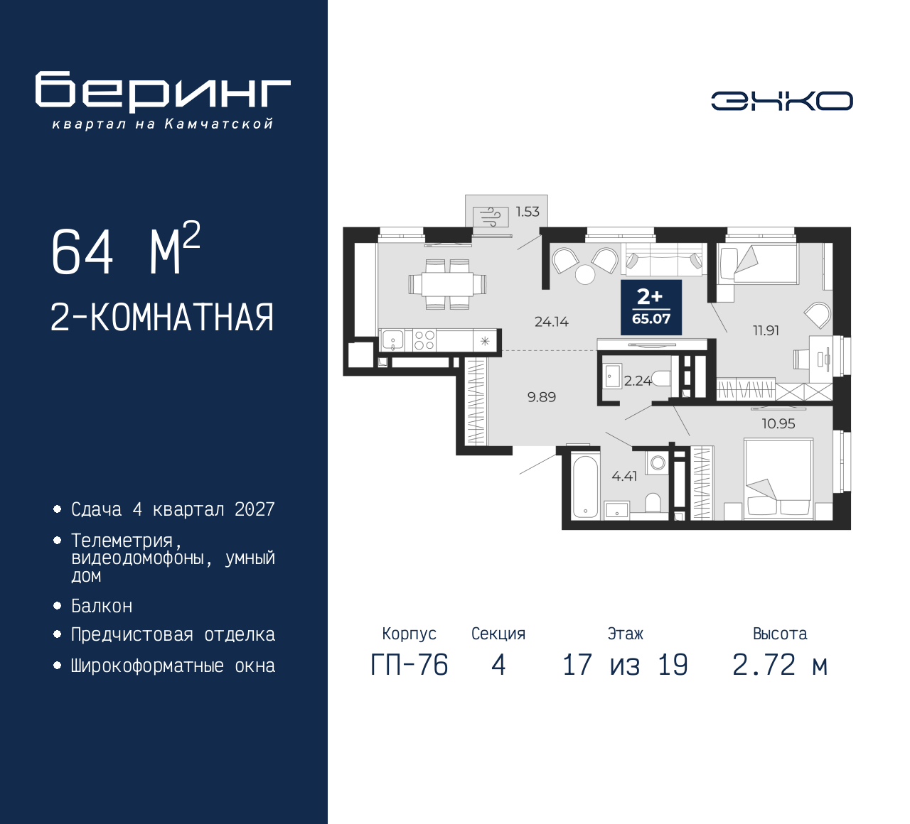Продается 2-комн. квартира с предчистовой отделкой в ЖК "Беринг" на 17 этаже. Общая площадь: 64 кв.м., жилая: 22.86 кв.м., площадь просторной кухни-столовой: 24.14 кв.м. Угловая квартира, идеально подойдет любителям тишины и панорамных видов. В квартире один балкон, один совмещенный и один раздельный санузел. Высота потолков 2.72 м. Дом монолитный, черырехподъездный, переменной этажности, от 19 до 24 этажей. Квартира находится в 4-й секции высотой 19 этажей в корпусе ГП-76. На этаже 5 квартир. В подъезде 1 пассажирский и 1 грузовой лифт. Окончание строительства - 4 квартал 2027 года. Оформление сделки по договору долевого участия. Подобно знаменитому исследователю, мы чувствуем себя первооткрывателями этой локации. Хотим показать новую суть места, сформировать для вас жизненный опыт, которого ещё не было. Беринг — район зелёного цвета. Беринг — район, который откроется вам с другой стороны. Впечатлит новым уровнем комфорта и качеством жизни. Беринг — открытие на карте города. Первый квартал расположен в районе Тура, в границах улиц: Камчатская – Западносибирская – Энтузиастов. Вокруг уже есть всё для того, чтобы ежедневная рутина была лишь частью жизни и не доставляла дискомфорта. Школы и детские сады, магазины и аптеки, поликлиника, места для семейного отдыха, пеших и велопрогулок, и даже рыбалки. Масштабное озеленение дворов — визитная карточка ЭНКО и ваш оазис спокойствия, чтобы отвлечься от повседневности. Раскидистые деревья, кустарники, травы и цветы — осталось остановиться, вдохнуть и расслабиться, глядя на эту природную красоту. Стилистика подъездов продолжает концепцию Беринга, вдохновлённого Камчаткой: сдержанный, но при этом впечатляющий дизайн соседствует с удобством и функциональностью. (AQID02518393)
