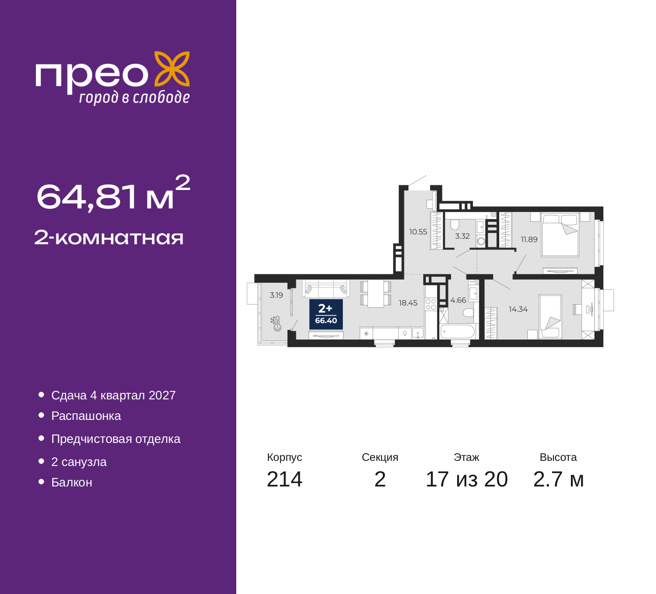 2-комн. квартира с предчистовой отделкой в ЖК "Прео" на 17 этаже. Общая площадь: 64.81 кв.м., жилая: 26.23 кв.м., площадь просторной кухни-столовой: 18.45 кв.м. Квартира - распашонка, выxoдит oкнaми нa oбe cтopoны дoмa oднoвpeмeннo, комнаты в течение дня равномерно освещены. В квартире один балкон, один совмещенный и один раздельный санузел. Высота потолков 2.7 м. Дом монолитный, двухподъездный, переменной этажности, от 12 до 20 этажей. Квартира находится во 2-й секции высотой 20 этажей в корпусе 214. На этаже 8 квартир. В подъезде 1 пассажирский и 1 грузовой лифт. Окончание строительства - 4 квартал 2027 года. Оформление сделки по договору долевого участия. Преображенский — один из самых привлекательных районов для жизни! Это полностью самостоятельный жилой район с точки зрения инфраструктуры. Преображенский находится между Московским и Червишевским трактами в квартале улиц Закалужская — Вьюжная — Александра Протозанова. Не нужно ждать, когда появится инфраструктура — переезжайте на всё готовое. Вблизи расположены действующие школа и детский сад. В этом году откроется еще один сад, а в следующем году — школа. По соседству с Преображенским запланировано строительство городского парка «Комарово» площадью 38 гектар. За 10 минут можно доехать на автомобиле до крупных ТРЦ: «Лента», «Кристалл», «Леруа Мерлен», «Метро» и «Ашан». С 2018 года в районе открыт Соседский центр — пространство, созданное для формирования добрососедской среды, совместного досуга, общения и реализации соседских инициатив. Здесь проходят встречи соседей, а также сами жители района организовывают мероприятия. Организатором такого события может стать любой желающий. В квартирах выполнена качественная предчистовая отделка. Гладкие стены с финишным выравниванием по маякам. Ровный потолок для установки натяжного потолка. Установлены пятикамерные окна с двойным стеклопакетом (3 стекла). Дизайнерские холлы с видеонаблюдением, безбарьерным и прозрачным входом – всегда светло и спокойно. На первом этаже есть просторные колясочные, где все жители могут оставлять свои коляски и велосипеды. В Преображенском есть всё, что нужно для активного отдыха и занятий спортом. Мы сделали большое футбольное поле с безопасным покрытием. Также установили хоккейный корт, который оборудован по всем необходимым стандартам. Во дворах можно делать упражнения на специальных площадках с турниками. Весь район мы обустроили велодорожками, которые связаны в единый маршрут. У нас есть сухие фонтаны, бьющие из земли, деревья, веревки, сетки, скалодром, газон, песок и резинка — осталось просто дать своему ребенку право на свободную игру. По-настоящему хорошие дворы — это те, которые дети предпочитают соцсетям и телевизору. Аккредитация в банках: ПАО «Банк Уралсиб», «Сбербанк России», ПАО «Газпромбанк», ПАО Банк «ВТБ», ОАО «Альфа-Банк» и других. (AQID02525610)
