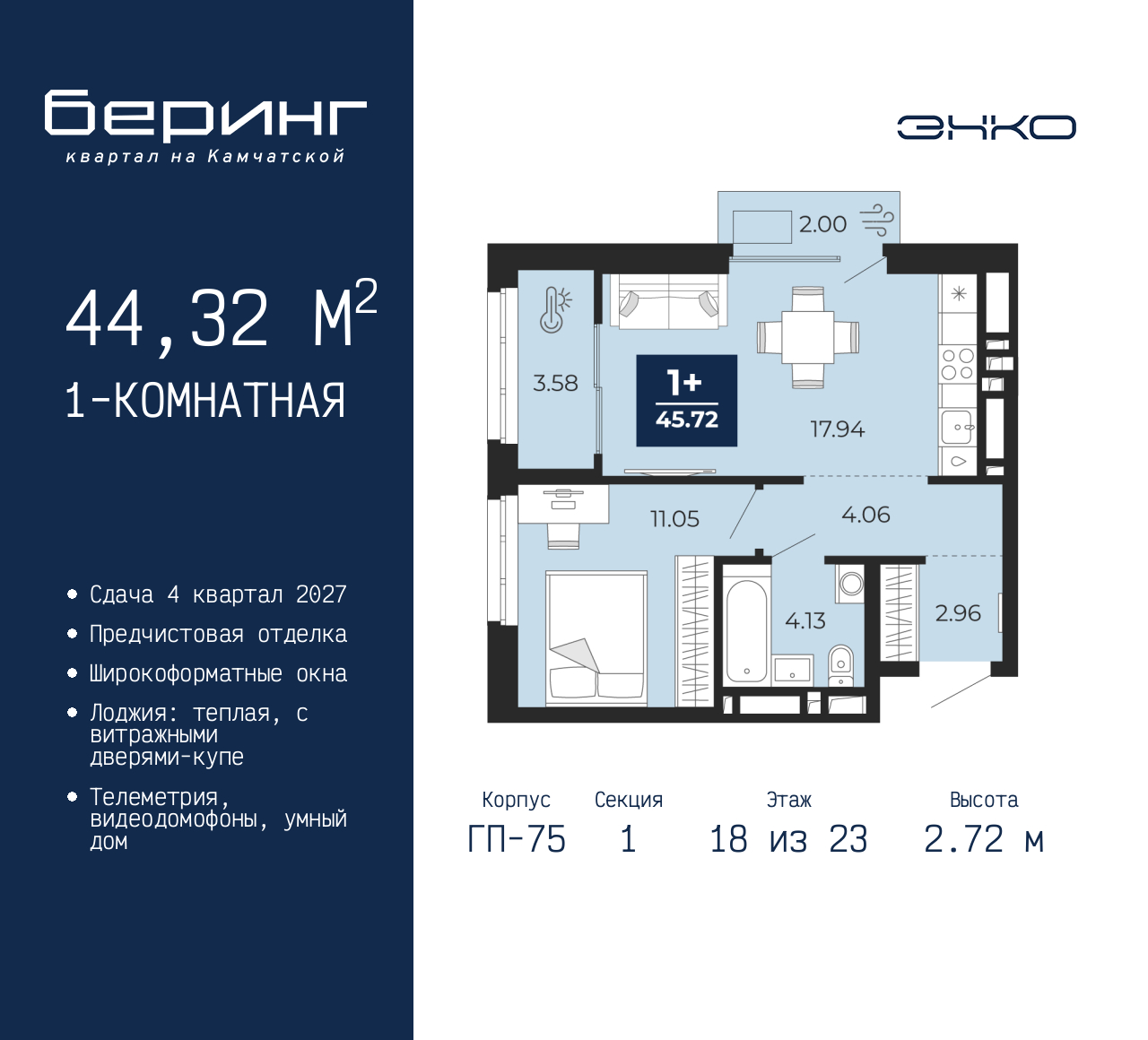 Просторная 1-комн. квартира с предчистовой отделкой в ЖК "Беринг" на 18 этаже. Общая площадь: 44.32 кв.м., жилая: 11.05 кв.м., площадь просторной кухни-столовой: 17.94 кв.м. Квартира угловая, идеально подойдет любителям тишины и панорамных видов. В квартире один балкон и одна лоджия, один совмещенный санузел. Высота потолков 2.72 м. Дом монолитный, многоподъездный, переменной этажности, от 17 до 24 этажей. Квартира находится в 1-й секции высотой 23 этажа в корпусе ГП-75. На этаже 8 квартир. В подъезде 2 пассажирских и 1 грузовой лифт. Окончание строительства - 4 квартал 2027 года. Оформление сделки по договору долевого участия. Подобно знаменитому исследователю, мы чувствуем себя первооткрывателями этой локации. Хотим показать новую суть места, сформировать для вас жизненный опыт, которого ещё не было. Беринг — район зелёного цвета. Беринг — район, который откроется вам с другой стороны. Впечатлит новым уровнем комфорта и качеством жизни. Беринг — открытие на карте города. Первый квартал расположен в районе Тура, в границах улиц: Камчатская – Западносибирская – Энтузиастов. Вокруг уже есть всё для того, чтобы ежедневная рутина была лишь частью жизни и не доставляла дискомфорта. Школы и детские сады, магазины и аптеки, поликлиника, места для семейного отдыха, пеших и велопрогулок, и даже рыбалки. Масштабное озеленение дворов — визитная карточка ЭНКО и ваш оазис спокойствия, чтобы отвлечься от повседневности. Раскидистые деревья, кустарники, травы и цветы — осталось остановиться, вдохнуть и расслабиться, глядя на эту природную красоту. Стилистика подъездов продолжает концепцию Беринга, вдохновлённого Камчаткой: сдержанный, но при этом впечатляющий дизайн соседствует с удобством и функциональностью. (AQID02529614)
