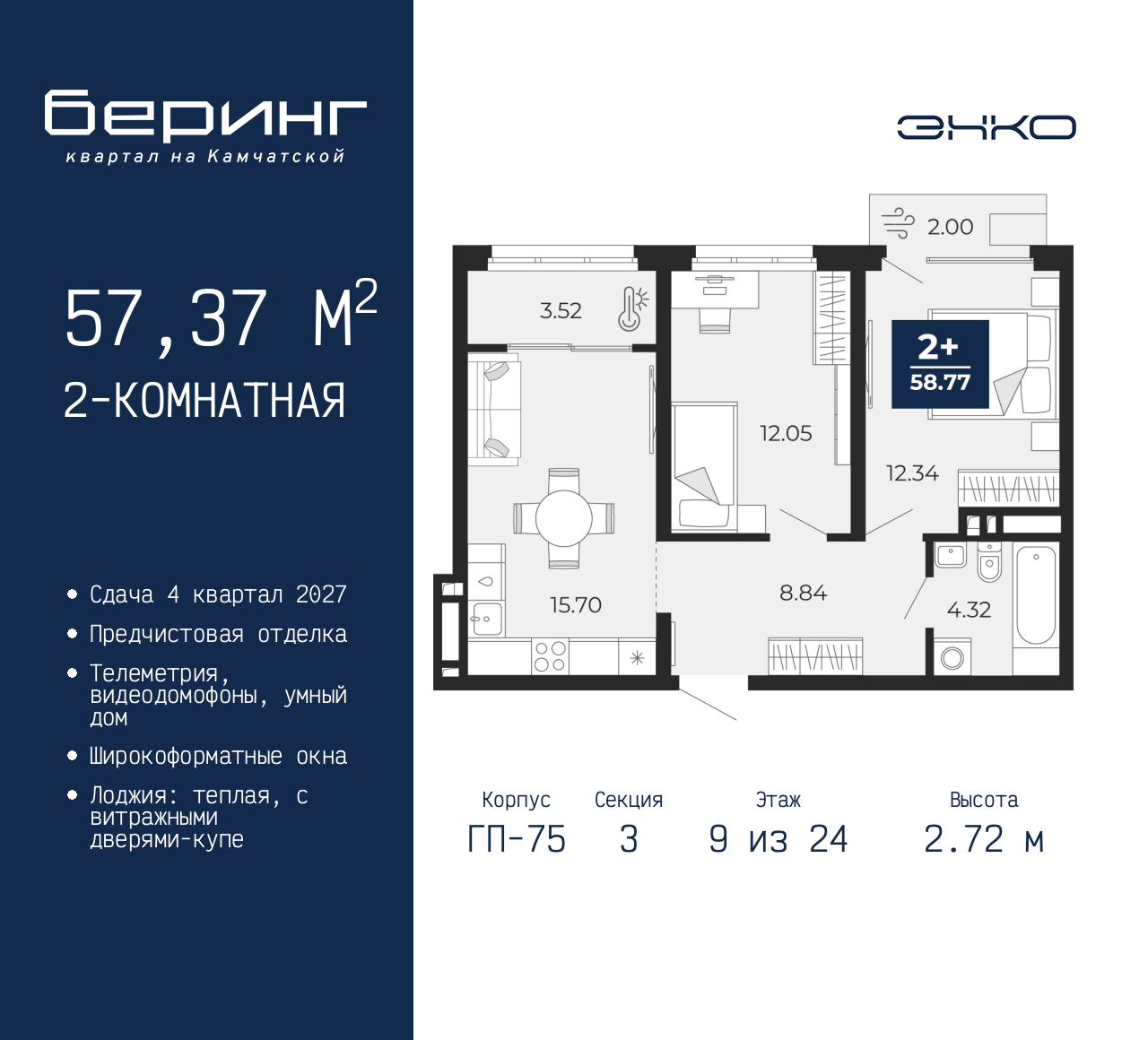Двухкомнатная квартира с предчистовой отделкой в ЖК "Беринг" на 9 этаже. Общая площадь: 57.37 кв.м., жилая: 24.39 кв.м., площадь просторной кухни-столовой: 15.7 кв.м. Комнаты изолированные, все окна выходят на одну сторону. В квартире один балкон и одна лоджия, один совмещенный санузел. Высота потолков 2.72 м. Дом монолитный, многоподъездный, переменной этажности, от 17 до 24 этажей. Квартира находится в 3-й секции высотой 24 этажа в корпусе ГП-75. На этаже 6 квартир. В подъезде 2 пассажирских и 1 грузовой лифт. Окончание строительства - 4 квартал 2027 года. Оформление сделки по договору долевого участия. Подобно знаменитому исследователю, мы чувствуем себя первооткрывателями этой локации. Хотим показать новую суть места, сформировать для вас жизненный опыт, которого ещё не было. Беринг — район зелёного цвета. Беринг — район, который откроется вам с другой стороны. Впечатлит новым уровнем комфорта и качеством жизни. Беринг — открытие на карте города. Первый квартал расположен в районе Тура, в границах улиц: Камчатская – Западносибирская – Энтузиастов. Вокруг уже есть всё для того, чтобы ежедневная рутина была лишь частью жизни и не доставляла дискомфорта. Школы и детские сады, магазины и аптеки, поликлиника, места для семейного отдыха, пеших и велопрогулок, и даже рыбалки. Масштабное озеленение дворов — визитная карточка ЭНКО и ваш оазис спокойствия, чтобы отвлечься от повседневности. Раскидистые деревья, кустарники, травы и цветы — осталось остановиться, вдохнуть и расслабиться, глядя на эту природную красоту. Стилистика подъездов продолжает концепцию Беринга, вдохновлённого Камчаткой: сдержанный, но при этом впечатляющий дизайн соседствует с удобством и функциональностью. (AQID02529698)