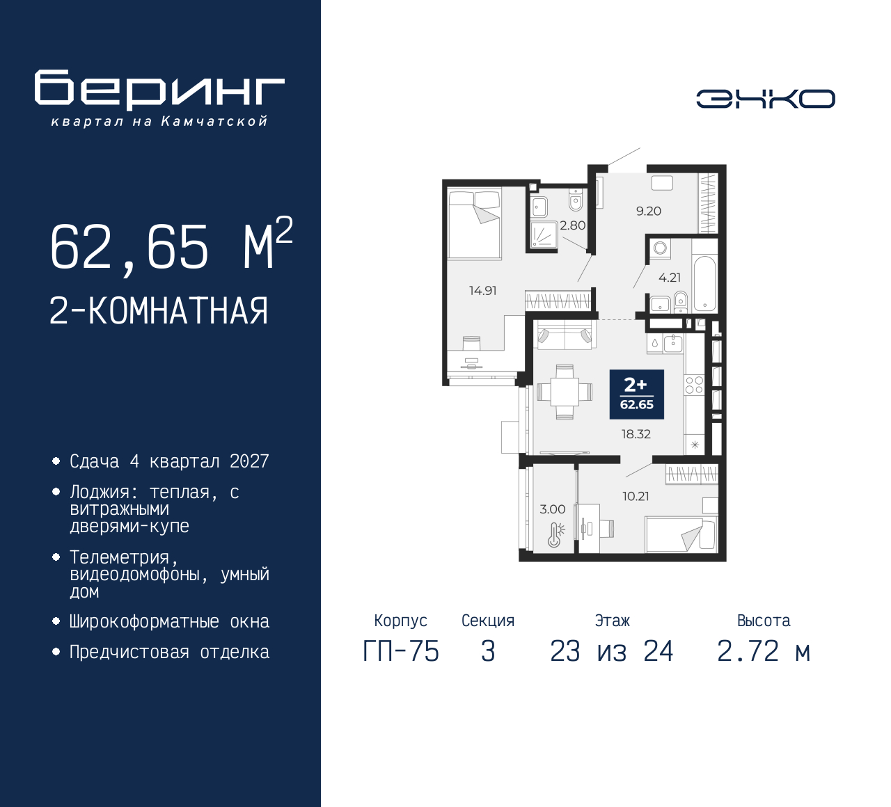 2-комн. квартира от застройщика с предчистовой отделкой в ЖК "Беринг" на 23 этаже. Общая площадь: 62.65 кв.м., жилая: 25.12 кв.м., площадь просторной кухни-столовой: 18.32 кв.м. Комнаты изолированные, все окна выходят на одну сторону. В квартире одна лоджия, два совмещенных санузла. Высота потолков 2.72 м. Дом монолитный, многоподъездный, переменной этажности, от 17 до 24 этажей. Квартира находится в 3-й секции высотой 24 этажа в корпусе ГП-75. На этаже 6 квартир. В подъезде 2 пассажирских и 1 грузовой лифт. Окончание строительства - 4 квартал 2027 года. Оформление сделки по договору долевого участия. Подобно знаменитому исследователю, мы чувствуем себя первооткрывателями этой локации. Хотим показать новую суть места, сформировать для вас жизненный опыт, которого ещё не было. Беринг — район зелёного цвета. Беринг — район, который откроется вам с другой стороны. Впечатлит новым уровнем комфорта и качеством жизни. Беринг — открытие на карте города. Первый квартал расположен в районе Тура, в границах улиц: Камчатская – Западносибирская – Энтузиастов. Вокруг уже есть всё для того, чтобы ежедневная рутина была лишь частью жизни и не доставляла дискомфорта. Школы и детские сады, магазины и аптеки, поликлиника, места для семейного отдыха, пеших и велопрогулок, и даже рыбалки. Масштабное озеленение дворов — визитная карточка ЭНКО и ваш оазис спокойствия, чтобы отвлечься от повседневности. Раскидистые деревья, кустарники, травы и цветы — осталось остановиться, вдохнуть и расслабиться, глядя на эту природную красоту. Стилистика подъездов продолжает концепцию Беринга, вдохновлённого Камчаткой: сдержанный, но при этом впечатляющий дизайн соседствует с удобством и функциональностью. (AQID02529747)