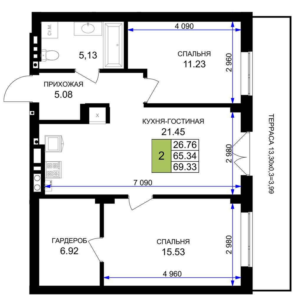 Квартира 2-комн., 69 м2, 1/7 этаж,