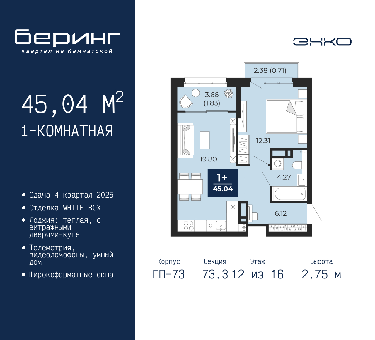 Просторная 1-комн. квартира в ЖК "Беринг" на 12 этаже. Квартира без отделки, после получения ключей можно делать ремонт. Общая площадь: 45.04 кв.м., жилая: 12.31 кв.м., площадь просторной кухни-столовой: 19.8 кв.м. Все окна выходят на одну сторону. В квартире один балкон и одна лоджия, один совмещенный санузел. Высота потолков 2.75 м. Дом монолитный, многоподъездный, переменной этажности, от 9 до 22 этажей. Квартира находится в 73.3-й секции высотой 16 этажей в корпусе ГП-73. На этаже 8 квартир. В подъезде 1 пассажирский и 1 грузовой лифт. Окончание строительства - 4 квартал 2025 года. Оформление сделки по договору долевого участия. Подобно знаменитому исследователю, мы чувствуем себя первооткрывателями этой локации. Хотим показать новую суть места, сформировать для вас жизненный опыт, которого ещё не было. Беринг — район зелёного цвета. Беринг — район, который откроется вам с другой стороны. Впечатлит новым уровнем комфорта и качеством жизни. Беринг — открытие на карте города. Первый квартал расположен в районе Тура, в границах улиц: Камчатская – Западносибирская – Энтузиастов. Вокруг уже есть всё для того, чтобы ежедневная рутина была лишь частью жизни и не доставляла дискомфорта. Школы и детские сады, магазины и аптеки, поликлиника, места для семейного отдыха, пеших и велопрогулок, и даже рыбалки. Масштабное озеленение дворов — визитная карточка ЭНКО и ваш оазис спокойствия, чтобы отвлечься от повседневности. Раскидистые деревья, кустарники, травы и цветы — осталось остановиться, вдохнуть и расслабиться, глядя на эту природную красоту. Стилистика подъездов продолжает концепцию Беринга, вдохновлённого Камчаткой: сдержанный, но при этом впечатляющий дизайн соседствует с удобством и функциональностью. (AQID02529861)