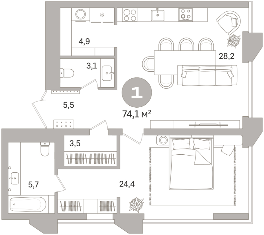 Квартира 1-комн., 74 м2, 19/25 этаж,