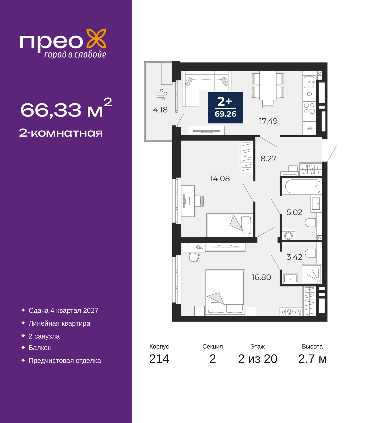 Двухкомнатная квартира с предчистовой отделкой в ЖК "Прео" на 2 этаже. Общая площадь: 66.33 кв.м., жилая: 30.88 кв.м., площадь просторной кухни-столовой: 17.49 кв.м. Комнаты изолированные, все окна выходят на одну сторону. В квартире один балкон, два совмещенных санузла. Высота потолков 2.7 м. Дом монолитный, двухподъездный, переменной этажности, от 12 до 20 этажей. Квартира находится во 2-й секции высотой 20 этажей в корпусе 214. На этаже 8 квартир. В подъезде 1 пассажирский и 1 грузовой лифт. Окончание строительства - 4 квартал 2027 года. Оформление сделки по договору долевого участия. Преображенский — один из самых привлекательных районов для жизни! Это полностью самостоятельный жилой район с точки зрения инфраструктуры. Преображенский находится между Московским и Червишевским трактами в квартале улиц Закалужская — Вьюжная — Александра Протозанова. Не нужно ждать, когда появится инфраструктура — переезжайте на всё готовое. Вблизи расположены действующие школа и детский сад. В этом году откроется еще один сад, а в следующем году — школа. По соседству с Преображенским запланировано строительство городского парка «Комарово» площадью 38 гектар. За 10 минут можно доехать на автомобиле до крупных ТРЦ: «Лента», «Кристалл», «Леруа Мерлен», «Метро» и «Ашан». С 2018 года в районе открыт Соседский центр — пространство, созданное для формирования добрососедской среды, совместного досуга, общения и реализации соседских инициатив. Здесь проходят встречи соседей, а также сами жители района организовывают мероприятия. Организатором такого события может стать любой желающий. В квартирах выполнена качественная предчистовая отделка. Гладкие стены с финишным выравниванием по маякам. Ровный потолок для установки натяжного потолка. Установлены пятикамерные окна с двойным стеклопакетом (3 стекла). Дизайнерские холлы с видеонаблюдением, безбарьерным и прозрачным входом – всегда светло и спокойно. На первом этаже есть просторные колясочные, где все жители могут оставлять свои коляски и велосипеды. В Преображенском есть всё, что нужно для активного отдыха и занятий спортом. Мы сделали большое футбольное поле с безопасным покрытием. Также установили хоккейный корт, который оборудован по всем необходимым стандартам. Во дворах можно делать упражнения на специальных площадках с турниками. Весь район мы обустроили велодорожками, которые связаны в единый маршрут. У нас есть сухие фонтаны, бьющие из земли, деревья, веревки, сетки, скалодром, газон, песок и резинка — осталось просто дать своему ребенку право на свободную игру. По-настоящему хорошие дворы — это те, которые дети предпочитают соцсетям и телевизору. Аккредитация в банках: «Сбербанк России», ПАО «Банк Уралсиб», ОАО «Альфа-Банк», ПАО Банк «ВТБ», ПАО «Газпромбанк» и других. (AQID02525548)