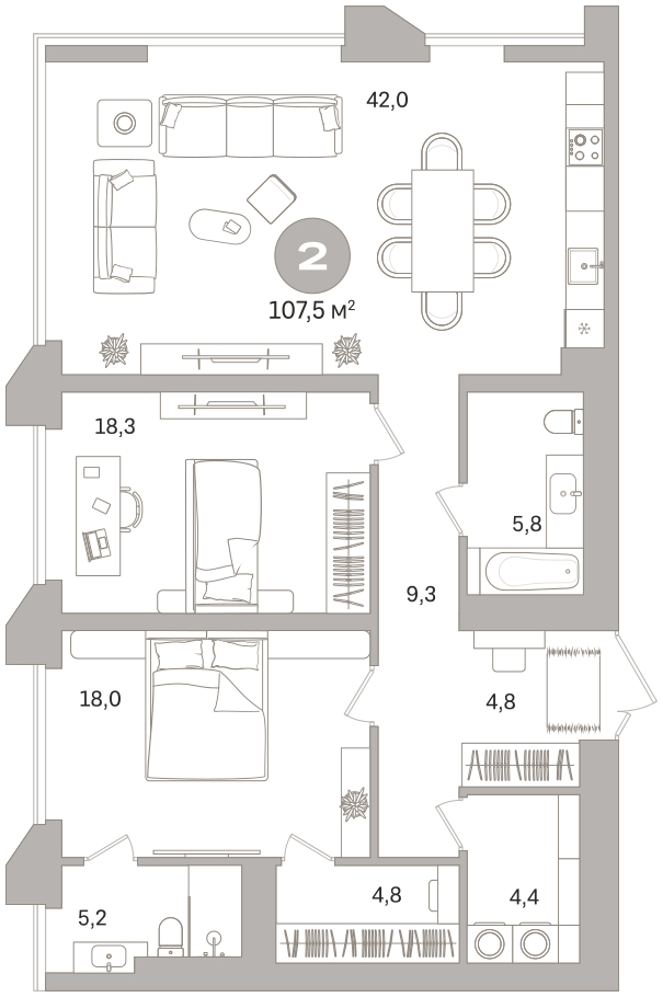 2-комн. квартира с предчистовой отделкой в ЖК «Гоголя 21" на 4 этаже. Общая площадь: 107.46 кв.м., жилая: 36.3 кв.м., площадь просторной кухни-столовой: 42 кв.м. Угловая квартира, идеально подойдет любителям тишины и панорамных видов. В квартире два совмещенных санузла. Высота потолков 2.98 м. Дом монолитный, двухподъездный, переменной этажности, от 21 до 25 этажей. Квартира находится в 1-й секции высотой 25 этажей в корпусе 1. На этаже 5 квартир. В подъезде 2 пассажирских и 1 грузовой лифт. Начало строительства - 3 квартал 2025 года. Окончание строительства - 3 квартал 2028 года. Оформление сделки по договору долевого участия. Квартира с кухней-гостиной и двумя спальнями в проекте Гоголя 21. Особенности планировки: свободная планировка. № квартиры в нашей базе: ЗНГ01-Ж1.4.2. (AQID02531282)