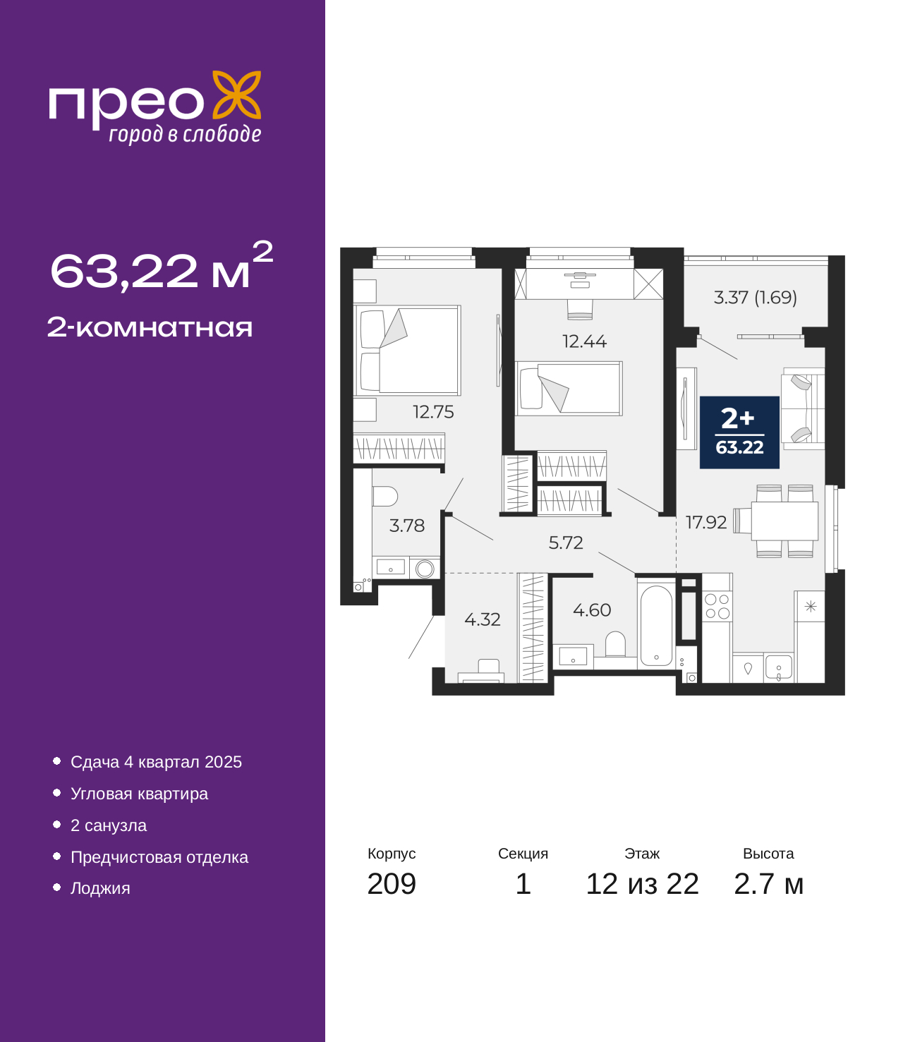 Просторная двухкомнатная квартира с предчистовой отделкой в ЖК "Прео" на 12 этаже. Общая площадь: 63.22 кв.м., жилая: 25.19 кв.м., площадь просторной кухни-столовой: 17.92 кв.м. Угловая квартира, очень светлая, естественная вентиляция при открытии окон. В квартире одна лоджия, один совмещенный и один раздельный санузел. Высота потолков 2.7 м. Квартира находится в корпусе 209. Дом монолитный, одноподъездный, высотой 22 этажа. На этаже 8 квартир. В подъезде 1 пассажирский и 1 грузовой лифт. Окончание строительства - 4 квартал 2025 года. Оформление сделки по договору долевого участия. Преображенский — один из самых привлекательных районов для жизни! Это полностью самостоятельный жилой район с точки зрения инфраструктуры. Преображенский находится между Московским и Червишевским трактами в квартале улиц Закалужская — Вьюжная — Александра Протозанова. Не нужно ждать, когда появится инфраструктура — переезжайте на всё готовое. Вблизи расположены действующие школа и детский сад. В этом году откроется еще один сад, а в следующем году — школа. По соседству с Преображенским запланировано строительство городского парка «Комарово» площадью 38 гектар. За 10 минут можно доехать на автомобиле до крупных ТРЦ: «Лента», «Кристалл», «Леруа Мерлен», «Метро» и «Ашан». С 2018 года в районе открыт Соседский центр — пространство, созданное для формирования добрососедской среды, совместного досуга, общения и реализации соседских инициатив. Здесь проходят встречи соседей, а также сами жители района организовывают мероприятия. Организатором такого события может стать любой желающий. В квартирах выполнена качественная предчистовая отделка. Гладкие стены с финишным выравниванием по маякам. Ровный потолок для установки натяжного потолка. Установлены пятикамерные окна с двойным стеклопакетом (3 стекла). Дизайнерские холлы с видеонаблюдением, безбарьерным и прозрачным входом – всегда светло и спокойно. На первом этаже есть просторные колясочные, где все жители могут оставлять свои коляски и велосипеды. В Преображенском есть всё, что нужно для активного отдыха и занятий спортом. Мы сделали большое футбольное поле с безопасным покрытием. Также установили хоккейный корт, который оборудован по всем необходимым стандартам. Во дворах можно делать упражнения на специальных площадках с турниками. Весь район мы обустроили велодорожками, которые связаны в единый маршрут. У нас есть сухие фонтаны, бьющие из земли, деревья, веревки, сетки, скалодром, газон, песок и резинка — осталось просто дать своему ребенку право на свободную игру. По-настоящему хорошие дворы — это те, которые дети предпочитают соцсетям и телевизору. (AQID02532113)