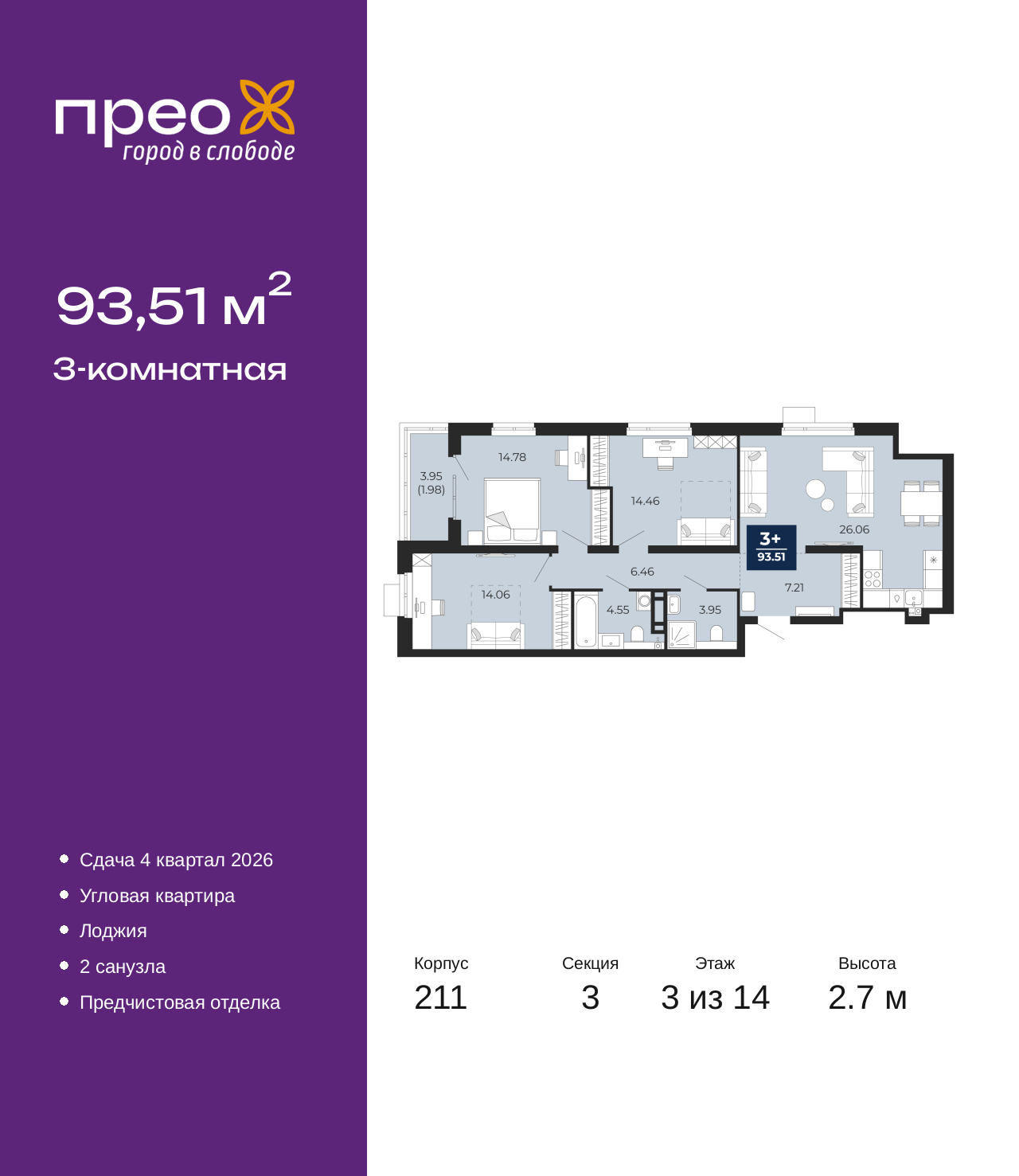 3-комн. квартира от застройщика с предчистовой отделкой в ЖК "Прео" на 3 этаже. Общая площадь: 93.51 кв.м., жилая: 43.3 кв.м., площадь просторной кухни-столовой: 26.06 кв.м. Угловая квартира, очень светлая, естественная вентиляция при открытии окон. В квартире одна лоджия, два совмещенных санузла. Высота потолков 2.7 м. Дом монолитный, черырехподъездный, переменной этажности, от 14 до 21 этажей. Квартира находится в 3-й секции высотой 14 этажей в корпусе 211. На этаже 6 квартир. В подъезде 1 пассажирский и 1 грузовой лифт. Окончание строительства - 4 квартал 2026 года. Оформление сделки по договору долевого участия. Преображенский — один из самых привлекательных районов для жизни! Это полностью самостоятельный жилой район с точки зрения инфраструктуры. Преображенский находится между Московским и Червишевским трактами в квартале улиц Закалужская — Вьюжная — Александра Протозанова. Не нужно ждать, когда появится инфраструктура — переезжайте на всё готовое. Вблизи расположены действующие школа и детский сад. В этом году откроется еще один сад, а в следующем году — школа. По соседству с Преображенским запланировано строительство городского парка «Комарово» площадью 38 гектар. За 10 минут можно доехать на автомобиле до крупных ТРЦ: «Лента», «Кристалл», «Леруа Мерлен», «Метро» и «Ашан». С 2018 года в районе открыт Соседский центр — пространство, созданное для формирования добрососедской среды, совместного досуга, общения и реализации соседских инициатив. Здесь проходят встречи соседей, а также сами жители района организовывают мероприятия. Организатором такого события может стать любой желающий. В квартирах выполнена качественная предчистовая отделка. Гладкие стены с финишным выравниванием по маякам. Ровный потолок для установки натяжного потолка. Установлены пятикамерные окна с двойным стеклопакетом (3 стекла). Дизайнерские холлы с видеонаблюдением, безбарьерным и прозрачным входом – всегда светло и спокойно. На первом этаже есть просторные колясочные, где все жители могут оставлять свои коляски и велосипеды. В Преображенском есть всё, что нужно для активного отдыха и занятий спортом. Мы сделали большое футбольное поле с безопасным покрытием. Также установили хоккейный корт, который оборудован по всем необходимым стандартам. Во дворах можно делать упражнения на специальных площадках с турниками. Весь район мы обустроили велодорожками, которые связаны в единый маршрут. У нас есть сухие фонтаны, бьющие из земли, деревья, веревки, сетки, скалодром, газон, песок и резинка — осталось просто дать своему ребенку право на свободную игру. По-настоящему хорошие дворы — это те, которые дети предпочитают соцсетям и телевизору. Аккредитация в банках: ПАО «Газпромбанк», ПАО Банк «ВТБ», ОАО «Альфа-Банк», ПАО «Банк Уралсиб», «Сбербанк России» и других. (AQID02526011)