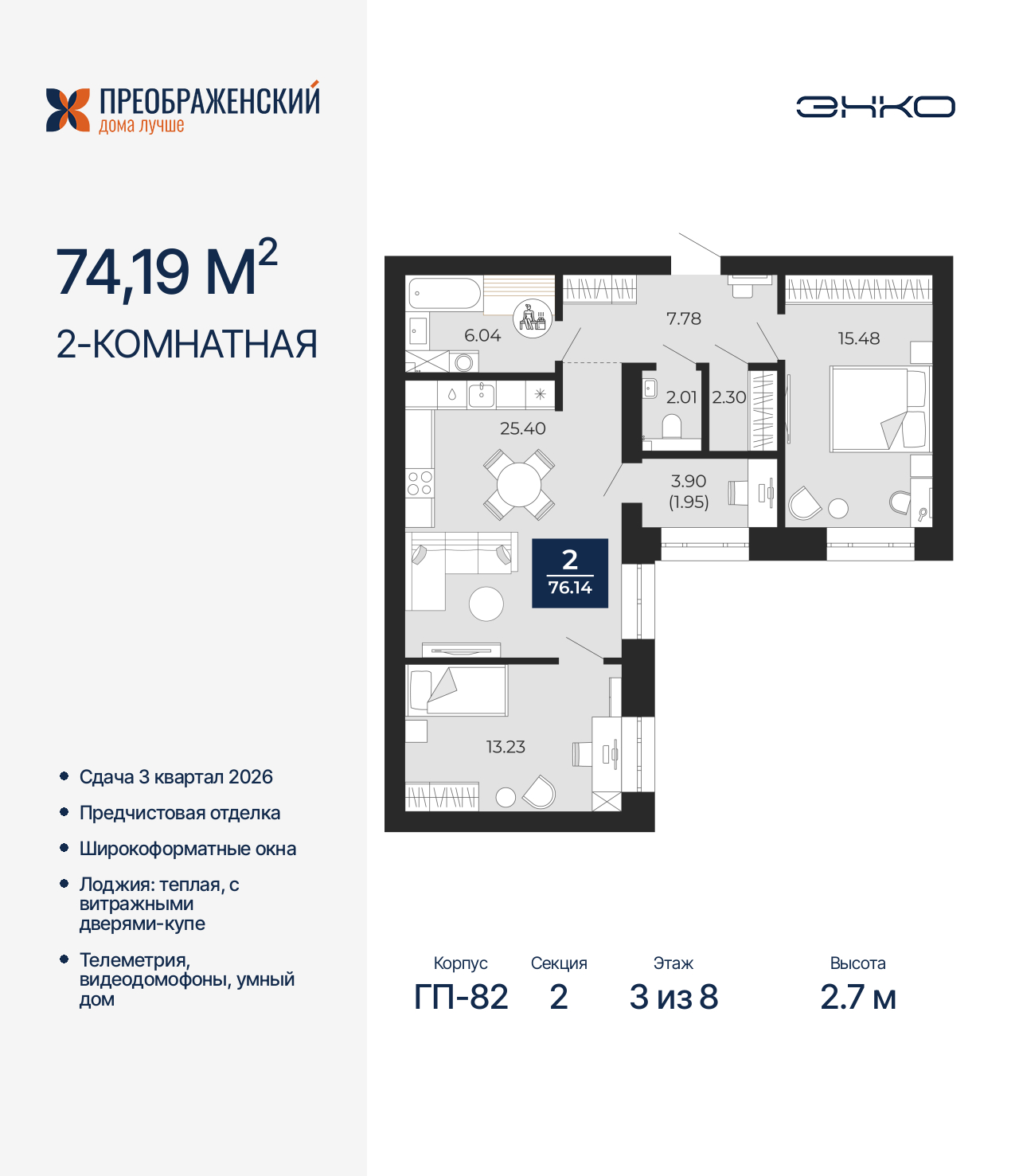 2-комн. квартира от застройщика с предчистовой отделкой в ЖК "Преображенский" на 3 этаже. Общая площадь: 74.19 кв.м., жилая: 28.71 кв.м., площадь просторной кухни-столовой: 25.4 кв.м. Квартира угловая, очень светлая, естественная вентиляция при открытии окон. В квартире одна лоджия, один раздельный санузел. Высота потолков 2.7 м. Дом монолитный, многоподъездный, переменной этажности, от 8 до 12 этажей. Квартира находится во 2-й секции высотой 8 этажей в корпусе ГП-82. На этаже 6 квартир. В подъезде 1 пассажирский и 1 грузовой лифт. Окончание строительства - 3 квартал 2026 года. Оформление сделки по договору долевого участия. Квартал будет расположен в микрорайоне Славянский на пересечении улиц Мира и 70-летия Октября. Престижный район, собственный парк, вся необходимая для жизни, учёбы и работы инфраструктура — новая школа с бассейном и кванториумом, новый детский сад, поликлиника, спорткомплекс, магазины и др. Чтобы в квартирах было как можно больше свободного пространства, мы предусмотрели индивидуальные кладовые на цокольном этаже. Оставляйте коляски и сезонный спортинвентарь после прогулок здесь — удобно для вас и чисто для квартиры. В подземный паркинг можно спуститься на лифте прямо с квартирной площадки. (AQID02484098)