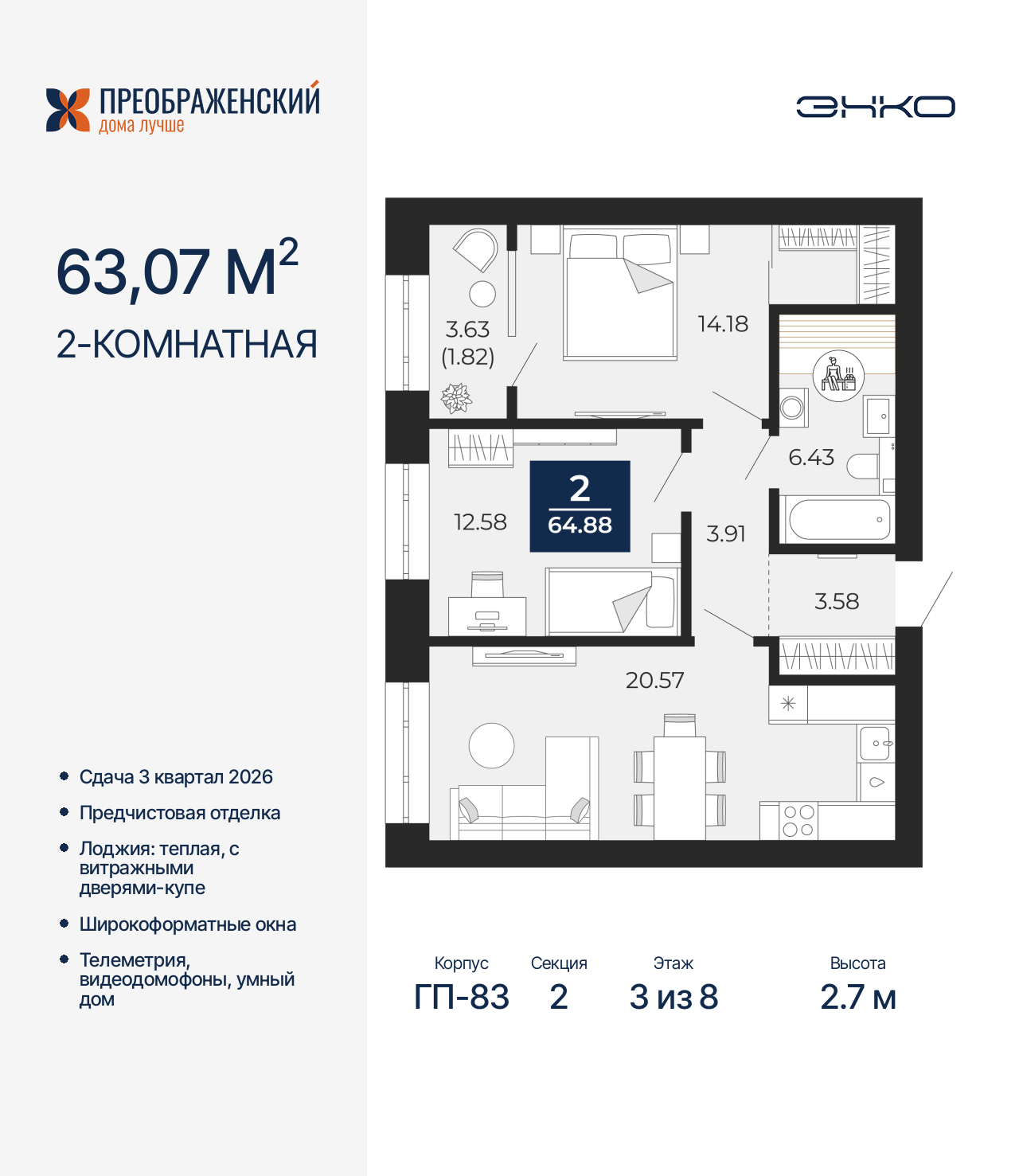 Продается 2-комн. квартира с предчистовой отделкой в ЖК "Преображенский" на 3 этаже. Общая площадь: 63.07 кв.м., жилая: 26.76 кв.м., площадь просторной кухни-столовой: 20.57 кв.м. Комнаты изолированные, все окна выходят на одну сторону. В квартире одна лоджия, один совмещенный санузел. Высота потолков 2.7 м. Дом монолитный, многоподъездный, переменной этажности, от 8 до 12 этажей. Квартира находится во 2-й секции высотой 8 этажей в корпусе ГП-83. На этаже 6 квартир. В подъезде 1 грузовой лифт. Начало строительства - 4 квартал 2023 года. Окончание строительства - 3 квартал 2026 года. Оформление сделки по договору долевого участия. Квартал будет расположен в микрорайоне Славянский на пересечении улиц Мира и 70-летия Октября. Престижный район, собственный парк, вся необходимая для жизни, учёбы и работы инфраструктура — новая школа с бассейном и кванториумом, новый детский сад, поликлиника, спорткомплекс, магазины и др. Чтобы в квартирах было как можно больше свободного пространства, мы предусмотрели индивидуальные кладовые на цокольном этаже. Оставляйте коляски и сезонный спортинвентарь после прогулок здесь — удобно для вас и чисто для квартиры. В подземный паркинг можно спуститься на лифте прямо с квартирной площадки. (AQID02484197)