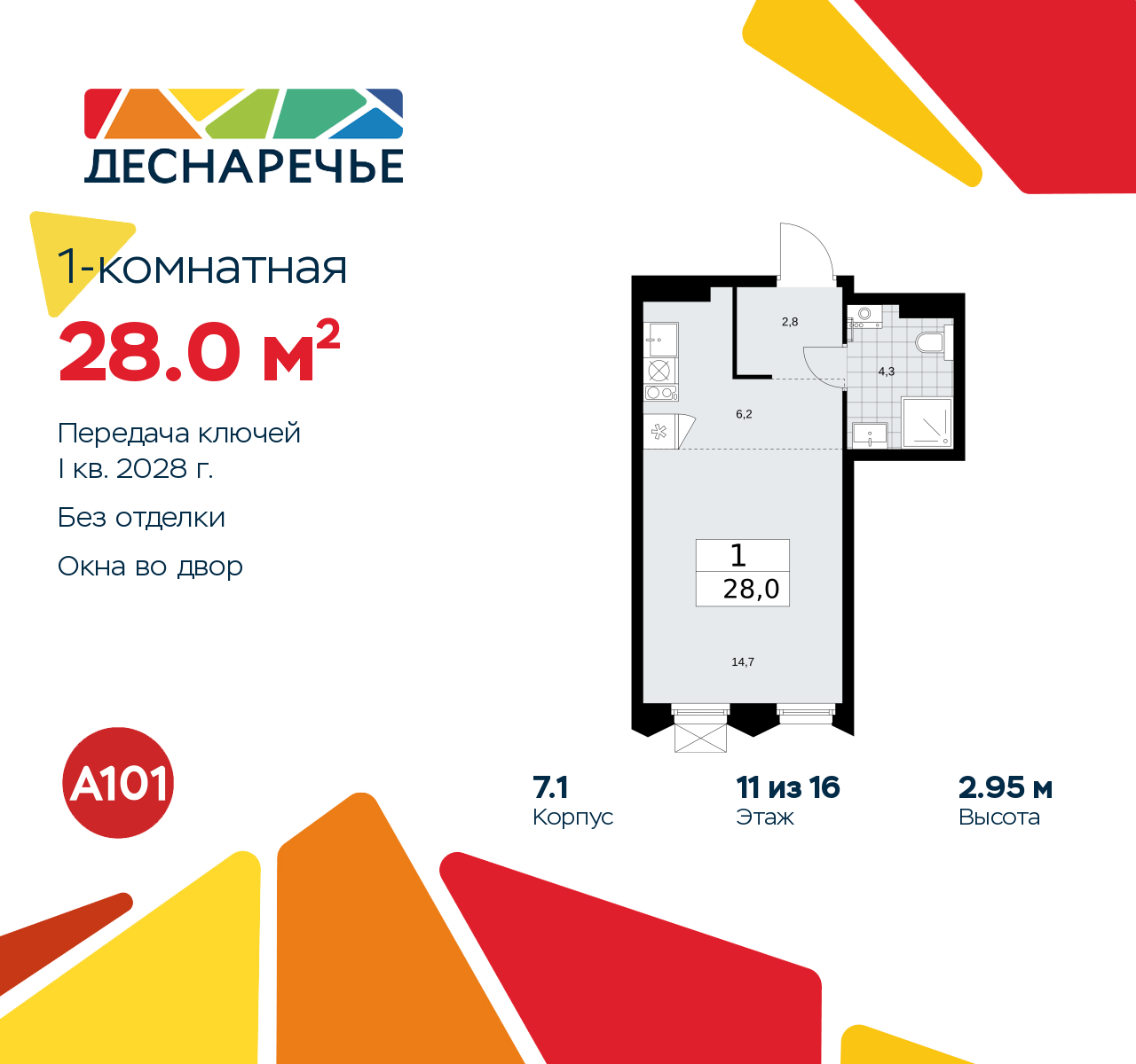 Просторная однокомнатная квартира-студия в ЖК "Деснаречье" на 11 этаже. Квартира без отделки, новый собственник может сделать ремонт по своему проекту. Общая площадь: 28 кв.м., площадь гостиной 20.9 кв.м., из которых 6.2 кв.м. выделено под кухонную зону. Все окна выходят на одну сторону. В квартире один совмещенный санузел. Высота потолков 2.95 м. Эта квартира предлагается без отделки. Будут установлены стеклопакеты с повышенной тепло- и шумоизоляцией, в квартиру заведены все коммуникации. Вы сможете в полном объеме реализовать ваши идеи обустройства вашего комфортного дома. Для тех, кто ценит время и не хочет дополнительных трат на ремонт мы предлагаем квартиры с предчистовой и дизайнерской отделкой. Дом монолитный, многоподъездный, переменной этажности, от 8 до 16 этажей. Квартира находится в 4-й секции высотой 11 этажей в корпусе 7.1. На этаже 5 квартир. В подъезде 1 пассажирский и 1 грузовой лифт. Начало строительства - 2 квартал 2025 года. Окончание строительства - 1 квартал 2028 года. Оформление сделки по договору долевого участия. Артикул квартиры по базе застройщика 88К-7.1-241. Масштабный проект "Деснаречье" на юго-западе Москвы, который включает три новых района («квартала»), объединённые общей идеей – воплотить в реальность мечты современных жителей столицы об интересном, комфортном и разноплановом городском пространстве в окружении рек и лесов, словно сошедших с полотен русских живописцев: - «Берег» оценят все, кому близка водная стихия: плеск волн, солнечные блики и прогулки вдоль тихого течения речи. - «Лес» утопает в зелени парков и лесов. Здесь соблюдён идеальный баланс загородного спокойствия и столичного комфорта. - «Парк», самый энергичный и яркий, отличается высокой концентрацией пространств для спорта и творчества. Жилой комплекс "Деснаречье" расположится в 12 км от МКАД по современному Калужскому шоссе. Внешний облик зданий соответствует современному стилю и стандартам, характерным и для других популярных проектов ГК «А101»: сочетание контрастных тонов, большое количество остекления, в котором отражается небо, гармония с природным окружением. Весь город - в вашем районе. Находиться на территории «15-минутного города» значит иметь всё необходимое для полноценной жизни в шаговой доступности. Маршруты в районе «Деснаречье» выстроены так, чтобы добраться до магазинов, парков, школ, салонов услуг и других объектов можно было всего за несколько минут пешком или на велосипеде. Двор закрытый от машин – это тишина, комфорт и безопасность, поэтому все машино-места (включая «семейные» и увеличенные, с возможностью установки роллетных шкафов) находятся в подземном паркинге. В паркинги можно спуститься на лифте из любого подъезда или по лестнице. Рядом с «Деснаречьем» в 2027 году планируется открытие станции метро «Десна», до которой будет удобно добраться пешком или на велосипеде. Дорога на автомобиле до перехватывающих парковок станций «Ольховая» и «Прокшино» займёт около 10 минут. В процессе реализации проекта будут появляться новые маршруты общественного транспорта по районам. Уже сейчас на Калужском шоссе развита сеть наземного транспорта: два десятка автобусов и маршрутных такси прибывают на остановки с интервалом 5–10 минут. (AQID02490546)