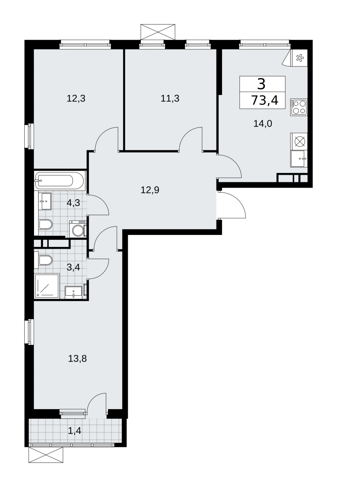 Просторная трехкомнатная квартира с отделкой "WHITE BOX" в ЖК "Прокшино" на 7 этаже. Общая площадь: 73.4 кв.м., жилая: 37.4 кв.м., площадь просторной кухни-столовой: 14 кв.м. Квартира без проходных комнат, окна выходят нa три cтopoны дома. В квартире один балкон, два совмещенных санузла. Высота потолков 2.8 м. Дом монолитный, многоподъездный, переменной этажности, от 13 до 16 этажей. Квартира находится в 1-й секции высотой 16 этажей в корпусе 11.2.3. На этаже 5 квартир. В подъезде 1 пассажирский и 1 грузовой лифт. Начало строительства - 3 квартал 2023 года. Окончание строительства - 2 квартал 2026 года. Оформление сделки по договору долевого участия. Артикул квартиры по базе застройщика 58К-11.2.3-450. В шаговой доступности от жилого комплекса расположены станции метро (расстояние по прямой): «Прокшино» (1.4 км), «Филатов луг» (1.8 км), также недалеко от этого корпуса находятся станции метро: «Саларьево», «Румянцево», «Теплый стан». ЖК «Прокшино» расположен в 7,6 км от МКАД в Новой Москве. В 8 минутах пешком находится станция метро "Прокшино" быстрой и комфортной красной линии метро. Высокую транспортную доступность обеспечивают и два крупных шоссе, до которых легко доехать за 5 минут по новой скоростной автотрассе Солнцево – Бутово – Варшавское шоссе. Жилой комплекс "Прокшино" входит в кластер Прокшино. В районе появятся дома комфорт и бизнес-класса с подземным паркингом, закрытыми благоустроенными дворами без машин, местами для активного и созерцательного отдыха, магазинами, бытовыми сервисами и другими коммерческими объектами. Рядом пруд с собственной набережной и городской парк «Хованская дубрава». Для маленьких жителей построят детские сады, образовательный комплекс. (AQID02525854)
