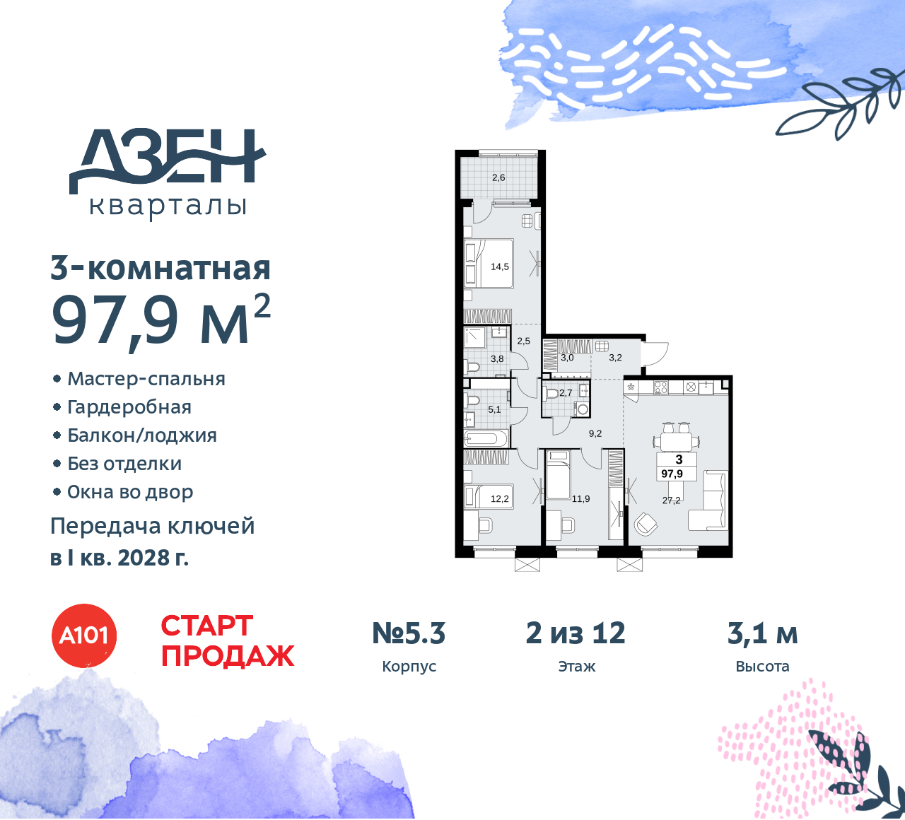 Просторная 3-комн. квартира бизнес-класса в ЖК "Дзен-кварталы" на 2 этаже. Квартира без отделки, полностью готова к чистовой отделке и дальнейшему ремонту. Общая площадь: 97.9 кв.м., жилая: 38.6 кв.м., площадь просторной кухни-столовой: 27.2 кв.м. Квартира - распашонка, без проходных комнат, окна выходят на paзные стороны дома. В квартире один балкон, два совмещенных и один раздельный санузел. Высота потолков 3.1 м. Эта квартира предлагается без отделки. Будут установлены стеклопакеты с повышенной тепло- и шумоизоляцией, в квартиру заведены все коммуникации. Вы сможете в полном объеме реализовать ваши идеи обустройства вашего комфортного дома. Имеется ниша под гардероб. Дом монолитный, трехподъездный, переменной этажности, от 8 до 12 этажей. Квартира находится в 3-й секции высотой 12 этажей в корпусе бизнес-класса 5.3. На этаже 5 квартир. В подъезде 1 пассажирский и 1 грузовой лифт. Начало строительства - 3 квартал 2025 года. Окончание строительства - 1 квартал 2028 года. Оформление сделки по договору долевого участия. Артикул квартиры по базе застройщика 41К-5.3-328. В шаговой доступности от жилого комплекса расположены станции метро (расстояние по прямой): «Новомосковская (Коммунарка)» (800 м), «Новомосковская» (800 м), «Потапово» (1.1 км), также недалеко от этого корпуса находятся станции метро: «Коммунарка», «Улица Горчакова», «Бульвар адмирала Ушакова», «Ольховая», «Бунинская аллея». Новый район «Дзен-кварталы» возводится на юго-западе столицы – вдоль береговой линии живописного Ивановского пруда и реки Варварки. В основе проекта – «сочетание несочетаемого», гармония простого и утончённого, природного и урбанистического – стиль Japandi, объединяющий скандинавскую функциональность и восточную созерцательность. В приятном соседстве с домами нового района живописный Ивановский пруд — его береговая линия проходит по территории «Дзен-кварталов». Здесь будет благоустроена набережная для отдыха жителей нового района — по авторскому проекту Группы компаний «А101». На территории района появятся два детских сада и крупный образовательный комплекс, в состав которого войдут детский сад и школа. Все они будут спроектированы на основе собственной концепции образовательной среды ГК «А101», разработанной экспертами в области педагогики, детский психологии и эргономики учебных пространств. Фасадные решения выполнены в современном архитектурном стиле, основанном на сочетании японского минимализма и скандинавской функциональности. Использованы природные оттенки спокойного японского пейзажа, материалы, имитирующие натуральные поверхности – штукатурка, облицовочная плитка разных размеров и текстур. Подобный стилистический подход делает пространство созерцательными и гармоничным. Для комфортного хранения габаритных и сезонных вещей на уровне подземного этажа спланированы удобные кладовые помещения. Доступ в них осуществляется на лифте. Отличная транспортная доступность. 2 станции метро, "Коммунарка" и "Потапово" в минутной шаговой доступности. Обстановки общественного транспорт, транспортные развязки и удобный выезд на трассу Солнцево – Бутово – Варшавское шоссе. (AQID02502230)