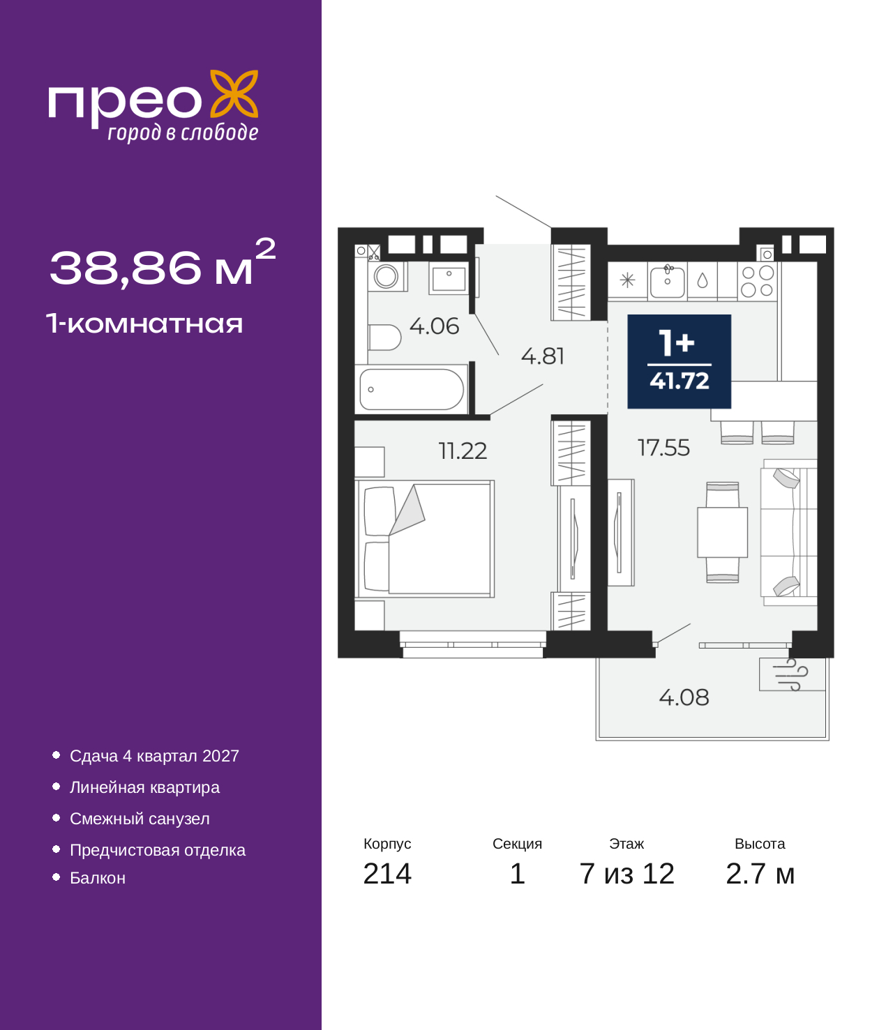 Продается 1-комн. квартира от застройщика с предчистовой отделкой в ЖК "Прео" на 7 этаже. Общая площадь: 38.86 кв.м., жилая: 11.22 кв.м., площадь просторной кухни-столовой: 17.55 кв.м. Все окна выходят на одну сторону. В квартире один балкон, один совмещенный санузел. Высота потолков 2.7 м. Дом монолитный, двухподъездный, переменной этажности, от 12 до 20 этажей. Квартира находится в 1-й секции высотой 12 этажей в корпусе 214. На этаже 8 квартир. В подъезде 1 пассажирский и 1 грузовой лифт. Окончание строительства - 4 квартал 2027 года. Оформление сделки по договору долевого участия. Преображенский — один из самых привлекательных районов для жизни! Это полностью самостоятельный жилой район с точки зрения инфраструктуры. Преображенский находится между Московским и Червишевским трактами в квартале улиц Закалужская — Вьюжная — Александра Протозанова. Не нужно ждать, когда появится инфраструктура — переезжайте на всё готовое. Вблизи расположены действующие школа и детский сад. В этом году откроется еще один сад, а в следующем году — школа. По соседству с Преображенским запланировано строительство городского парка «Комарово» площадью 38 гектар. За 10 минут можно доехать на автомобиле до крупных ТРЦ: «Лента», «Кристалл», «Леруа Мерлен», «Метро» и «Ашан». С 2018 года в районе открыт Соседский центр — пространство, созданное для формирования добрососедской среды, совместного досуга, общения и реализации соседских инициатив. Здесь проходят встречи соседей, а также сами жители района организовывают мероприятия. Организатором такого события может стать любой желающий. В квартирах выполнена качественная предчистовая отделка. Гладкие стены с финишным выравниванием по маякам. Ровный потолок для установки натяжного потолка. Установлены пятикамерные окна с двойным стеклопакетом (3 стекла). Дизайнерские холлы с видеонаблюдением, безбарьерным и прозрачным входом – всегда светло и спокойно. На первом этаже есть просторные колясочные, где все жители могут оставлять свои коляски и велосипеды. В Преображенском есть всё, что нужно для активного отдыха и занятий спортом. Мы сделали большое футбольное поле с безопасным покрытием. Также установили хоккейный корт, который оборудован по всем необходимым стандартам. Во дворах можно делать упражнения на специальных площадках с турниками. Весь район мы обустроили велодорожками, которые связаны в единый маршрут. У нас есть сухие фонтаны, бьющие из земли, деревья, веревки, сетки, скалодром, газон, песок и резинка — осталось просто дать своему ребенку право на свободную игру. По-настоящему хорошие дворы — это те, которые дети предпочитают соцсетям и телевизору. Аккредитация в банках: ПАО «Газпромбанк», ПАО «Банк Уралсиб», «Сбербанк России», ПАО Банк «ВТБ», ОАО «Альфа-Банк» и других. (AQID02532806)