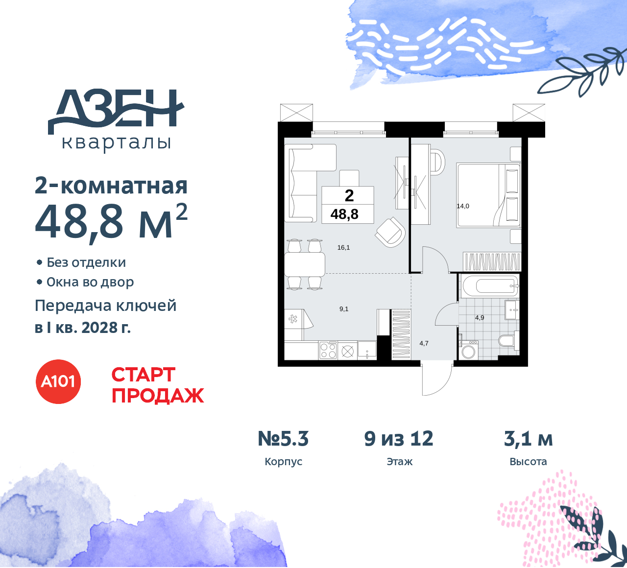 - Общая площадь 48.8 м²