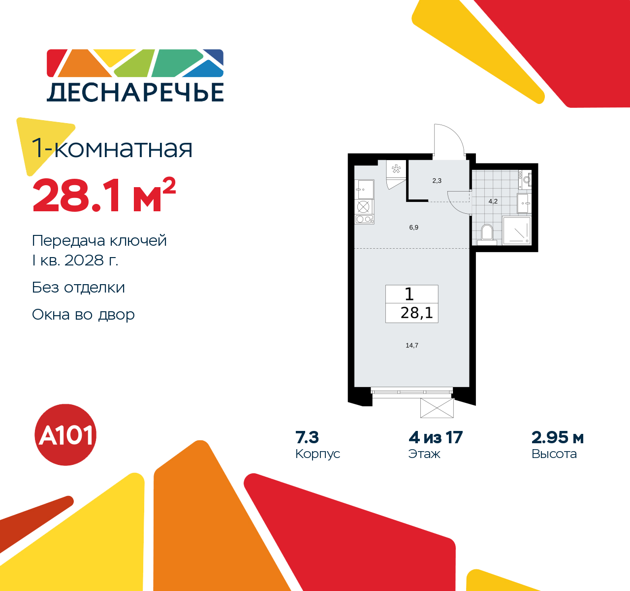 Продается однокомнатная квартира-студия от застройщика в ЖК "Деснаречье" на 4 этаже. Квартира без отделки, новый собственник может сделать ремонт по индивидуальному дизайн-проекту. Общая площадь: 28.1 кв.м., площадь гостиной 21 кв.м., из которых 6.3 кв.м. выделено под кухонную зону. Все окна выходят на одну сторону. В квартире один совмещенный санузел. Высота потолков 2.95 м. Эта квартира предлагается без отделки. Будут установлены стеклопакеты с повышенной тепло- и шумоизоляцией, в квартиру заведены все коммуникации. Вы сможете в полном объеме реализовать ваши идеи обустройства вашего комфортного дома. Для тех, кто ценит время и не хочет дополнительных трат на ремонт мы предлагаем квартиры с предчистовой и дизайнерской отделкой. Дом монолитный, черырехподъездный, переменной этажности, от 9 до 17 этажей. Квартира находится во 2-й секции высотой 9 этажей в корпусе 7.3. На этаже 5 квартир. В подъезде 1 пассажирский и 1 грузовой лифт. Начало строительства - 2 квартал 2025 года. Окончание строительства - 1 квартал 2028 года. Оформление сделки по договору долевого участия. Артикул квартиры по базе застройщика 88К-7.3-671. Масштабный проект "Деснаречье" на юго-западе Москвы, который включает три новых района («квартала»), объединённые общей идеей – воплотить в реальность мечты современных жителей столицы об интересном, комфортном и разноплановом городском пространстве в окружении рек и лесов, словно сошедших с полотен русских живописцев: - «Берег» оценят все, кому близка водная стихия: плеск волн, солнечные блики и прогулки вдоль тихого течения речи. - «Лес» утопает в зелени парков и лесов. Здесь соблюдён идеальный баланс загородного спокойствия и столичного комфорта. - «Парк», самый энергичный и яркий, отличается высокой концентрацией пространств для спорта и творчества. Жилой комплекс "Деснаречье" расположится в 12 км от МКАД по современному Калужскому шоссе. Внешний облик зданий соответствует современному стилю и стандартам, характерным и для других популярных проектов ГК «А101»: сочетание контрастных тонов, большое количество остекления, в котором отражается небо, гармония с природным окружением. Весь город - в вашем районе. Находиться на территории «15-минутного города» значит иметь всё необходимое для полноценной жизни в шаговой доступности. Маршруты в районе «Деснаречье» выстроены так, чтобы добраться до магазинов, парков, школ, салонов услуг и других объектов можно было всего за несколько минут пешком или на велосипеде. Двор закрытый от машин – это тишина, комфорт и безопасность, поэтому все машино-места (включая «семейные» и увеличенные, с возможностью установки роллетных шкафов) находятся в подземном паркинге. В паркинги можно спуститься на лифте из любого подъезда или по лестнице. Рядом с «Деснаречьем» в 2027 году планируется открытие станции метро «Десна», до которой будет удобно добраться пешком или на велосипеде. Дорога на автомобиле до перехватывающих парковок станций «Ольховая» и «Прокшино» займёт около 10 минут. В процессе реализации проекта будут появляться новые маршруты общественного транспорта по районам. Уже сейчас на Калужском шоссе развита сеть наземного транспорта: два десятка автобусов и маршрутных такси прибывают на остановки с интервалом 5–10 минут. (AQID02490969)