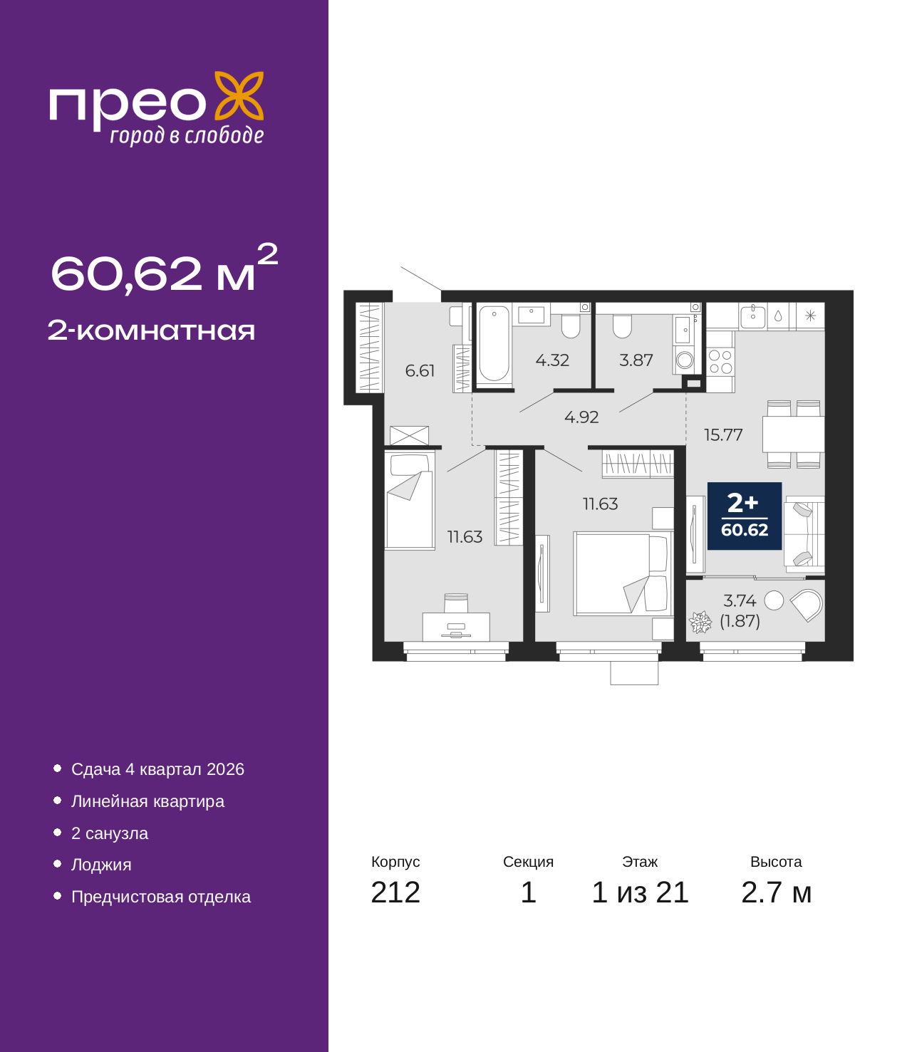 Просторная двухкомнатная квартира с предчистовой отделкой в ЖК "Прео" на 1 этаже. Общая площадь: 60.62 кв.м., жилая: 23.26 кв.м., площадь просторной кухни-столовой: 15.77 кв.м. Комнаты изолированные, все окна выходят на одну сторону. В квартире одна лоджия, один совмещенный и один раздельный санузел. Высота потолков 2.7 м. Квартира находится в корпусе 212. Дом монолитный, одноподъездный, высотой 21 этаж. На этаже 8 квартир. В подъезде 2 пассажирских и 1 грузовой лифт. Окончание строительства - 4 квартал 2026 года. Оформление сделки по договору долевого участия. Преображенский — один из самых привлекательных районов для жизни! Это полностью самостоятельный жилой район с точки зрения инфраструктуры. Преображенский находится между Московским и Червишевским трактами в квартале улиц Закалужская — Вьюжная — Александра Протозанова. Не нужно ждать, когда появится инфраструктура — переезжайте на всё готовое. Вблизи расположены действующие школа и детский сад. В этом году откроется еще один сад, а в следующем году — школа. По соседству с Преображенским запланировано строительство городского парка «Комарово» площадью 38 гектар. За 10 минут можно доехать на автомобиле до крупных ТРЦ: «Лента», «Кристалл», «Леруа Мерлен», «Метро» и «Ашан». С 2018 года в районе открыт Соседский центр — пространство, созданное для формирования добрососедской среды, совместного досуга, общения и реализации соседских инициатив. Здесь проходят встречи соседей, а также сами жители района организовывают мероприятия. Организатором такого события может стать любой желающий. В квартирах выполнена качественная предчистовая отделка. Гладкие стены с финишным выравниванием по маякам. Ровный потолок для установки натяжного потолка. Установлены пятикамерные окна с двойным стеклопакетом (3 стекла). Дизайнерские холлы с видеонаблюдением, безбарьерным и прозрачным входом – всегда светло и спокойно. На первом этаже есть просторные колясочные, где все жители могут оставлять свои коляски и велосипеды. В Преображенском есть всё, что нужно для активного отдыха и занятий спортом. Мы сделали большое футбольное поле с безопасным покрытием. Также установили хоккейный корт, который оборудован по всем необходимым стандартам. Во дворах можно делать упражнения на специальных площадках с турниками. Весь район мы обустроили велодорожками, которые связаны в единый маршрут. У нас есть сухие фонтаны, бьющие из земли, деревья, веревки, сетки, скалодром, газон, песок и резинка — осталось просто дать своему ребенку право на свободную игру. По-настоящему хорошие дворы — это те, которые дети предпочитают соцсетям и телевизору. Аккредитация в банках: «Сбербанк России», ПАО «Газпромбанк», ОАО «Альфа-Банк», ПАО Банк «ВТБ», ПАО «Банк Уралсиб» и других. (AQID02484560)