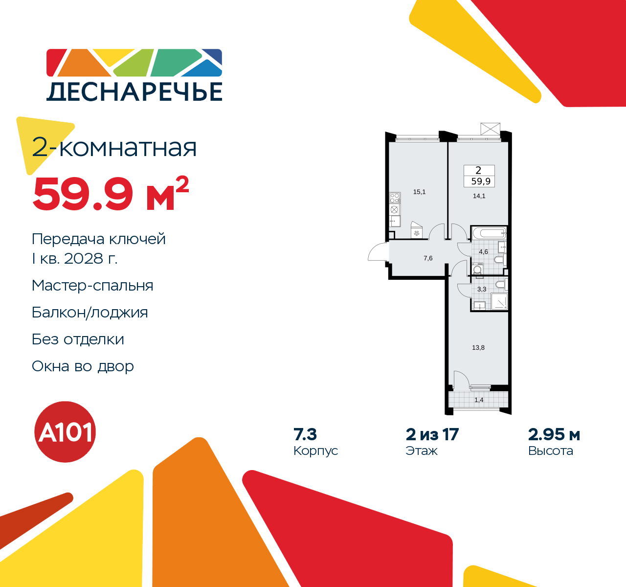 Продается двухкомнатная квартира в ЖК "Деснаречье" на 2 этаже. Квартира без отделки, новый собственник может сделать ремонт по индивидуальному проекту. Общая площадь: 59.9 кв.м., жилая: 27.9 кв.м., площадь просторной кухни-столовой: 15.1 кв.м. Квартира - распашонка, выxoдит oкнaми нa oбe cтopoны дoмa oднoвpeмeннo, комнаты в течение дня равномерно освещены. В квартире одна лоджия, два совмещенных санузла. Высота потолков 2.95 м. Эта квартира предлагается без отделки. Будут установлены стеклопакеты с повышенной тепло- и шумоизоляцией, в квартиру заведены все коммуникации. Вы сможете в полном объеме реализовать ваши идеи обустройства вашего комфортного дома. Для тех, кто ценит время и не хочет дополнительных трат на ремонт мы предлагаем квартиры с предчистовой и дизайнерской отделкой. Дом монолитный, черырехподъездный, переменной этажности, от 9 до 17 этажей. Квартира находится в 1-й секции высотой 15 этажей в корпусе 7.3. На этаже 5 квартир. В подъезде 1 пассажирский и 1 грузовой лифт. Начало строительства - 2 квартал 2025 года. Окончание строительства - 1 квартал 2028 года. Оформление сделки по договору долевого участия. Артикул квартиры по базе застройщика 88К-7.3-589. Масштабный проект "Деснаречье" на юго-западе Москвы, который включает три новых района («квартала»), объединённые общей идеей – воплотить в реальность мечты современных жителей столицы об интересном, комфортном и разноплановом городском пространстве в окружении рек и лесов, словно сошедших с полотен русских живописцев: - «Берег» оценят все, кому близка водная стихия: плеск волн, солнечные блики и прогулки вдоль тихого течения речи. - «Лес» утопает в зелени парков и лесов. Здесь соблюдён идеальный баланс загородного спокойствия и столичного комфорта. - «Парк», самый энергичный и яркий, отличается высокой концентрацией пространств для спорта и творчества. Жилой комплекс "Деснаречье" расположится в 12 км от МКАД по современному Калужскому шоссе. Внешний облик зданий соответствует современному стилю и стандартам, характерным и для других популярных проектов ГК «А101»: сочетание контрастных тонов, большое количество остекления, в котором отражается небо, гармония с природным окружением. Весь город - в вашем районе. Находиться на территории «15-минутного города» значит иметь всё необходимое для полноценной жизни в шаговой доступности. Маршруты в районе «Деснаречье» выстроены так, чтобы добраться до магазинов, парков, школ, салонов услуг и других объектов можно было всего за несколько минут пешком или на велосипеде. Двор закрытый от машин – это тишина, комфорт и безопасность, поэтому все машино-места (включая «семейные» и увеличенные, с возможностью установки роллетных шкафов) находятся в подземном паркинге. В паркинги можно спуститься на лифте из любого подъезда или по лестнице. Рядом с «Деснаречьем» в 2027 году планируется открытие станции метро «Десна», до которой будет удобно добраться пешком или на велосипеде. Дорога на автомобиле до перехватывающих парковок станций «Ольховая» и «Прокшино» займёт около 10 минут. В процессе реализации проекта будут появляться новые маршруты общественного транспорта по районам. Уже сейчас на Калужском шоссе развита сеть наземного транспорта: два десятка автобусов и маршрутных такси прибывают на остановки с интервалом 5–10 минут. (AQID02490888)