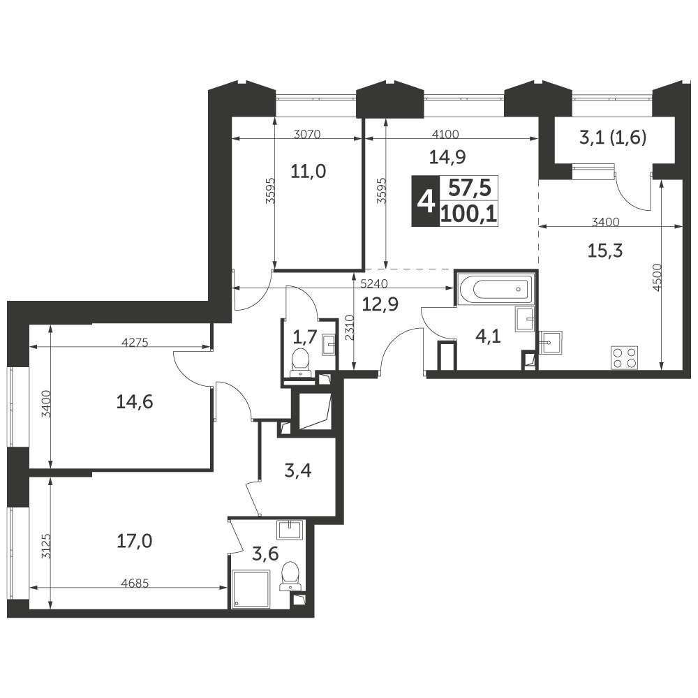 - Жилая площадь 57.5 м²