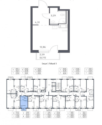 —Жилая площадь - 12,86 кв. м —Прихожая - 4,31 кв. м —Ванна - 3,29 кв. м —Высота потолков - 2.78 м , витражное остекление.—Тип дома - ЖБ/Монолит—Полная чистовая отделка.