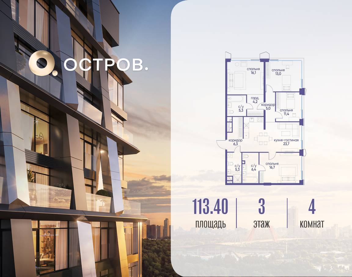 Продаётся четырехкомнатная квартира от застройщика: общая площадь 113.42 м², жилая 57.20 м², кухня 23.70 м², 3, жилой квартал «Остров 12», корпус 3 (12.1 квартал) (секция 1). срок сдачи: 4-кв. 2025. , 3 санузла: 3 совмещенных. В жилой зоне 2 больших окна на одну сторону, хорошая инсоляция. Позвоните сейчас и забронируйте квартиру! Купите квартиру для курортной жизни в Москве в квартале ОСТРОВ.12.1. Это единственный на ОСТРОВЕ квартал бизнес-класса, расположенный на первой линии у реки - здесь царит атмосфера ежедневного отпуска. Дома созданы в узнаваемом футуристичном стиле и выглядят как произведения современного искусства. Для жителей предусмотрены фитнес-рум и детский клуб, гостиная и кинотеатр, переговорные и репетиторские комнаты. На крышах устроены видовые общественные пространства с зонами для йоги, коворкингами, лаунжами. Двор-парк располагает всем необходимым для отдыха и общения всех возрастов. ОСТРОВ.12.1 - часть жилого комплекса на западе Москвы, в 15 минутах езды от центра. Это настоящий заповедник посреди большого города, в окружении реки и 650 га заповедников. Здесь все необходимое находится по соседству: от детского сада до супермаркета, от фитнес-зала до серфинг-центра. На территории созданы все условия для отдыха и общения: клубная инфраструктура в домах и дворы-парки, набережные и променады, маршруты для спортсменов, детей и возрастных жителей. В нескольких минутах ходьбы расположена станция метро "Мнёвники" БКЛ. На автомобиле - 10 минут до Москва-Сити и 15 минут до Садового кольца.