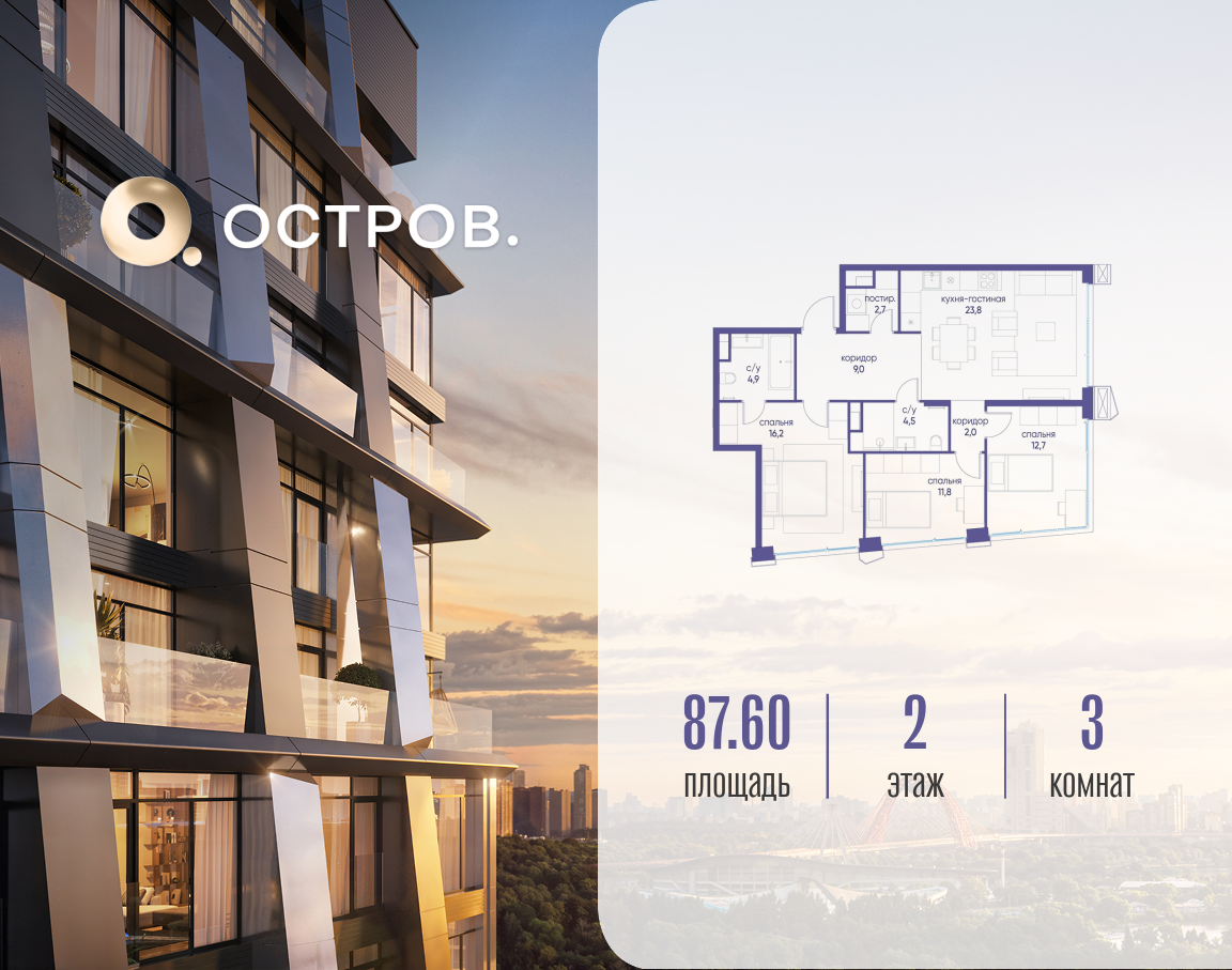 Продаётся 3-комн. квартира от застройщика: общая площадь 87.62 м², жилая 40.70 м², кухня 23.80 м², 2-й этаж, жилой квартал «Остров 12», корпус 2 (секция 1). Срок сдачи: 1 квартал 2029 года. 2 совмещенных санузла. В жилой зоне 2 больших окна на одну сторону, хорошая инсоляция. Позвоните сейчас и забронируйте квартиру! ОСТРОВ от Донстрой — жилой комплекс на западе Москвы, в Мневниковской пойме. Уникальное преимущество комплекса — в том, что он обособлен от города рекой и природным парком (650 га). Благодаря природному окружению эта территория имеет лучший экологический рейтинг в столице. Кварталы ОСТРОВА объединены ландшафтным дизайном в единое пространство — с набережными и Центральным бульваром. На ОСТРОВЕ любые объекты, необходимые для полноценной жизни и отдыха, находятся на расстоянии 15-минутной прогулки. Торговый центр и супермаркеты, кафе и рестораны, фитнес, салоны красоты, школы и детские сады. А также крупнейший в Москве спортивный кластер.