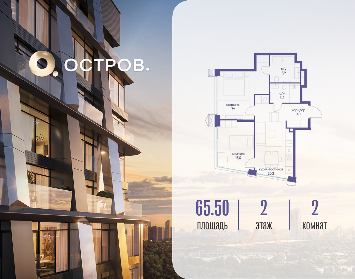 Продаётся 2-комн. квартира от застройщика: общая площадь 65.52 м², жилая 30.90 м², кухня 20.20 м², 2-й этаж, жилой квартал «Остров 12», корпус 2 (секция 1). Срок сдачи: 1 квартал 2029 года. 2 совмещенных санузла. В жилой зоне 2 больших окна на одну сторону, хорошая инсоляция. Позвоните сейчас и забронируйте квартиру! ОСТРОВ от Донстрой — жилой комплекс на западе Москвы, в Мневниковской пойме. Уникальное преимущество комплекса — в том, что он обособлен от города рекой и природным парком (650 га). Благодаря природному окружению эта территория имеет лучший экологический рейтинг в столице. Кварталы ОСТРОВА объединены ландшафтным дизайном в единое пространство — с набережными и Центральным бульваром. На ОСТРОВЕ любые объекты, необходимые для полноценной жизни и отдыха, находятся на расстоянии 15-минутной прогулки. Торговый центр и супермаркеты, кафе и рестораны, фитнес, салоны красоты, школы и детские сады. А также крупнейший в Москве спортивный кластер.