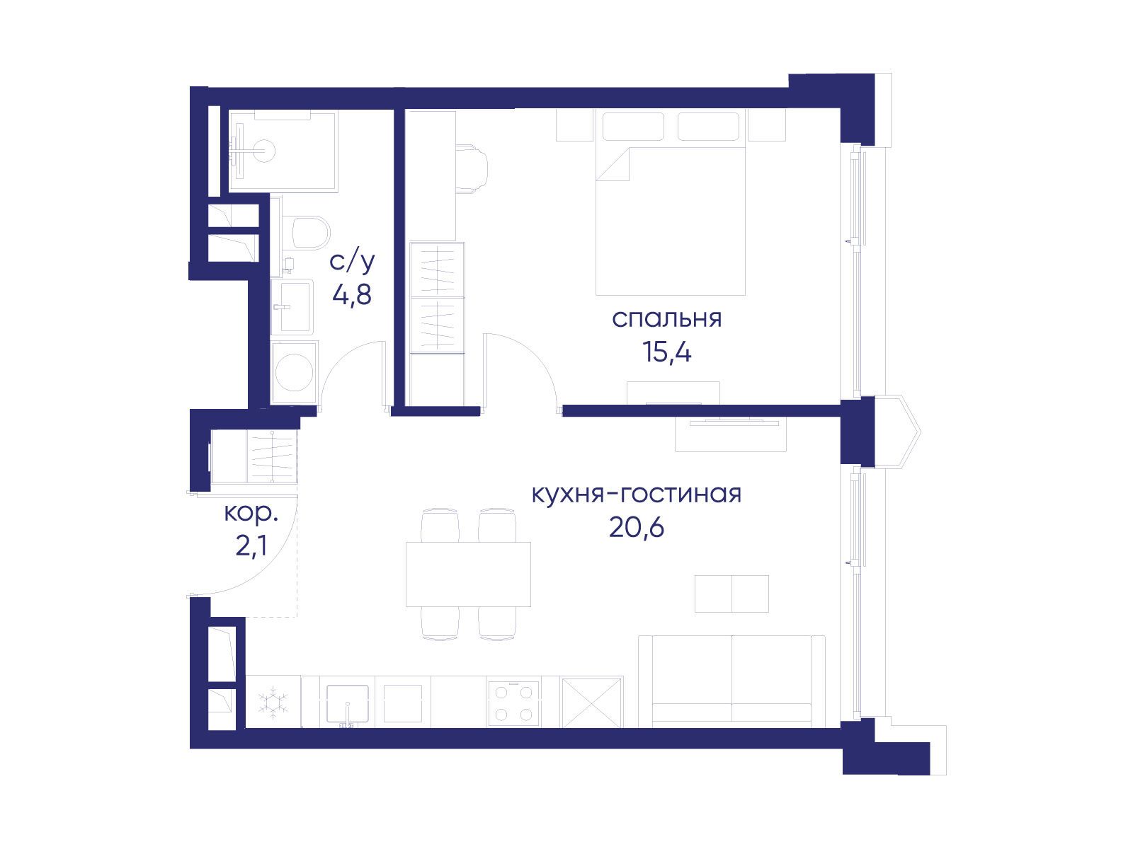 - Жилая площадь 15.4 м²