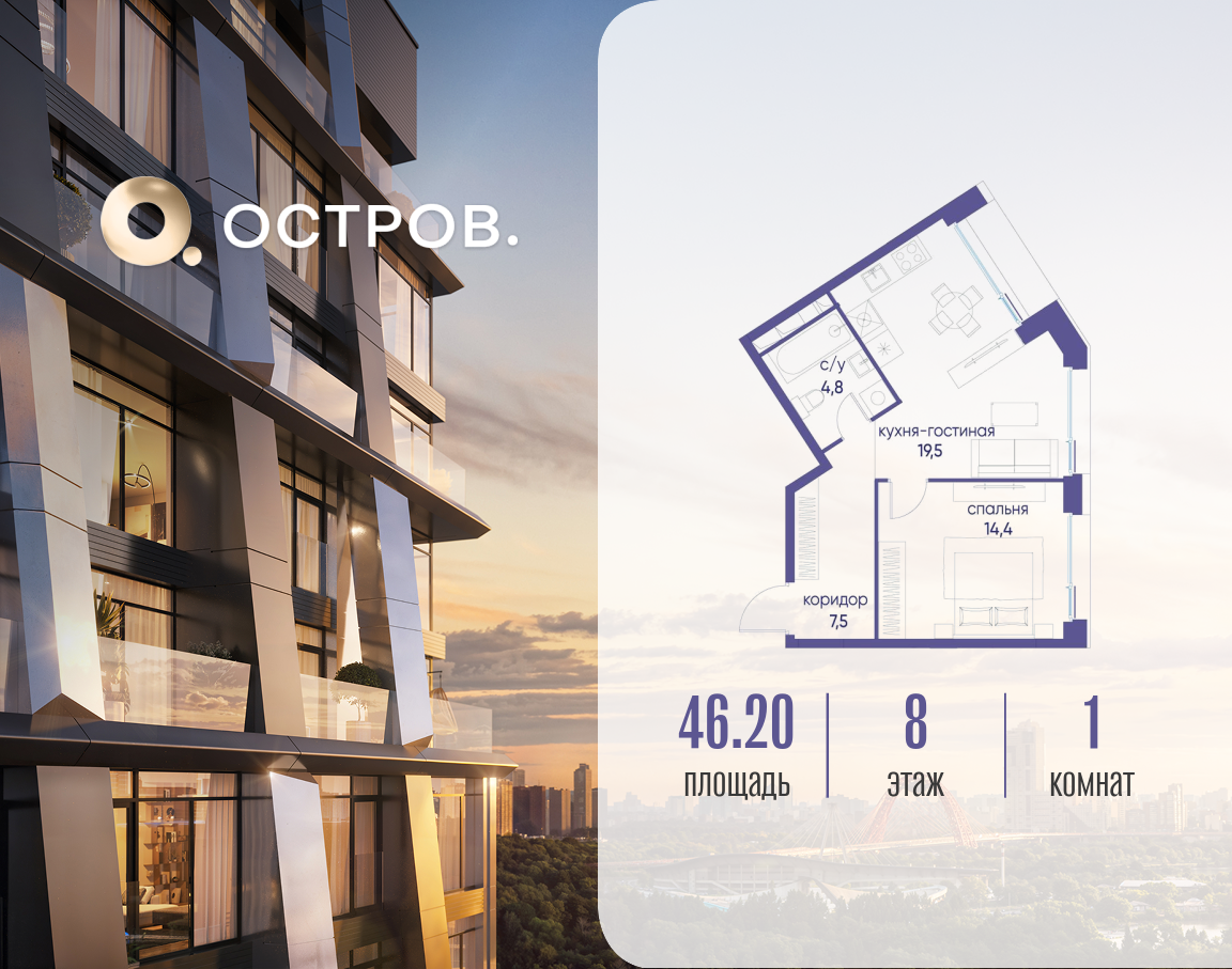 Скидка до 8% действует до 15.04.2026 г. при 100% оплате и не субсидированной ипотеке. Продаётся однокомнатная квартира от застройщика: общая площадь 46.22 м², жилая 14.40 м², кухня 19.50 м², 8, жилой квартал «Остров 12», корпус 1 (12.1 квартал) (секция 1). срок сдачи: 4-кв. 2025. , 2 санузла: 1 раздельный и 1 совмещенный. В жилой зоне 2 больших окна на одну сторону, хорошая инсоляция. Позвоните сейчас и забронируйте квартиру! Купите квартиру для курортной жизни в Москве в квартале ОСТРОВ.12.1. Это единственный на ОСТРОВЕ квартал бизнес-класса, расположенный на первой линии у реки - здесь царит атмосфера ежедневного отпуска. Дома созданы в узнаваемом футуристичном стиле и выглядят как произведения современного искусства. Для жителей предусмотрены фитнес-рум и детский клуб, гостиная и кинотеатр, переговорные и репетиторские комнаты. На крышах устроены видовые общественные пространства с зонами для йоги, коворкингами, лаунжами. Двор-парк располагает всем необходимым для отдыха и общения всех возрастов. ОСТРОВ.12.1 - часть жилого комплекса на западе Москвы, в 15 минутах езды от центра. Это настоящий заповедник посреди большого города, в окружении реки и 650 га заповедников. Здесь все необходимое находится по соседству: от детского сада до супермаркета, от фитнес-зала до серфинг-центра. На территории созданы все условия для отдыха и общения: клубная инфраструктура в домах и дворы-парки, набережные и променады, маршруты для спортсменов, детей и возрастных жителей. В нескольких минутах ходьбы расположена станция метро "Мнёвники" БКЛ. На автомобиле - 10 минут до Москва-Сити и 15 минут до Садового кольца.