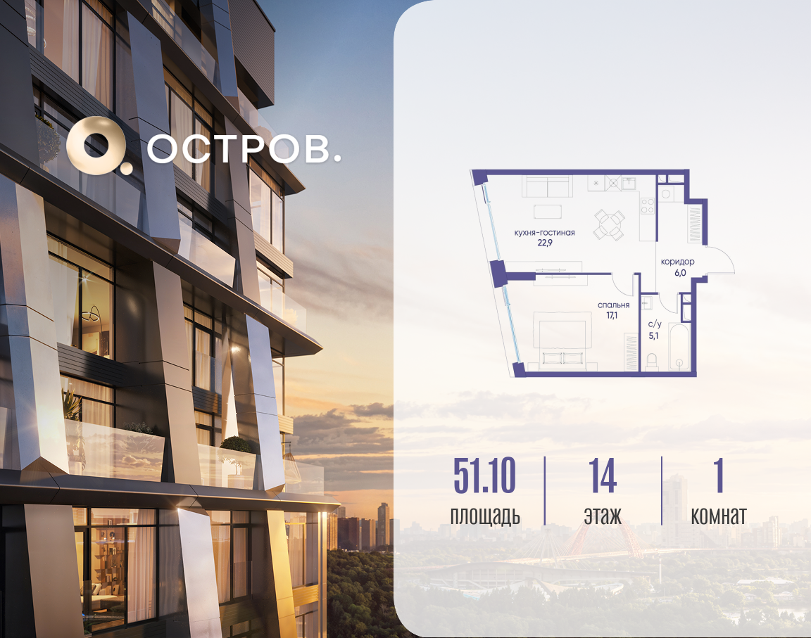 Скидка до 8% действует до 15.04.2026 г. при 100% оплате и не субсидированной ипотеке. Продаётся однокомнатная квартира от застройщика: общая площадь 51.12 м², жилая 17.10 м², кухня 22.90 м², 14, жилой квартал «Остров 12», корпус 1 (12.1 квартал) (секция 2). срок сдачи: 4-кв. 2025. , 1 совмещенный санузел. В жилой зоне 2 больших окна на одну сторону, хорошая инсоляция. Позвоните сейчас и забронируйте квартиру! Купите квартиру для курортной жизни в Москве в квартале ОСТРОВ.12.1. Это единственный на ОСТРОВЕ квартал бизнес-класса, расположенный на первой линии у реки - здесь царит атмосфера ежедневного отпуска. Дома созданы в узнаваемом футуристичном стиле и выглядят как произведения современного искусства. Для жителей предусмотрены фитнес-рум и детский клуб, гостиная и кинотеатр, переговорные и репетиторские комнаты. На крышах устроены видовые общественные пространства с зонами для йоги, коворкингами, лаунжами. Двор-парк располагает всем необходимым для отдыха и общения всех возрастов. ОСТРОВ.12.1 - часть жилого комплекса на западе Москвы, в 15 минутах езды от центра. Это настоящий заповедник посреди большого города, в окружении реки и 650 га заповедников. Здесь все необходимое находится по соседству: от детского сада до супермаркета, от фитнес-зала до серфинг-центра. На территории созданы все условия для отдыха и общения: клубная инфраструктура в домах и дворы-парки, набережные и променады, маршруты для спортсменов, детей и возрастных жителей. В нескольких минутах ходьбы расположена станция метро "Мнёвники" БКЛ. На автомобиле - 10 минут до Москва-Сити и 15 минут до Садового кольца.