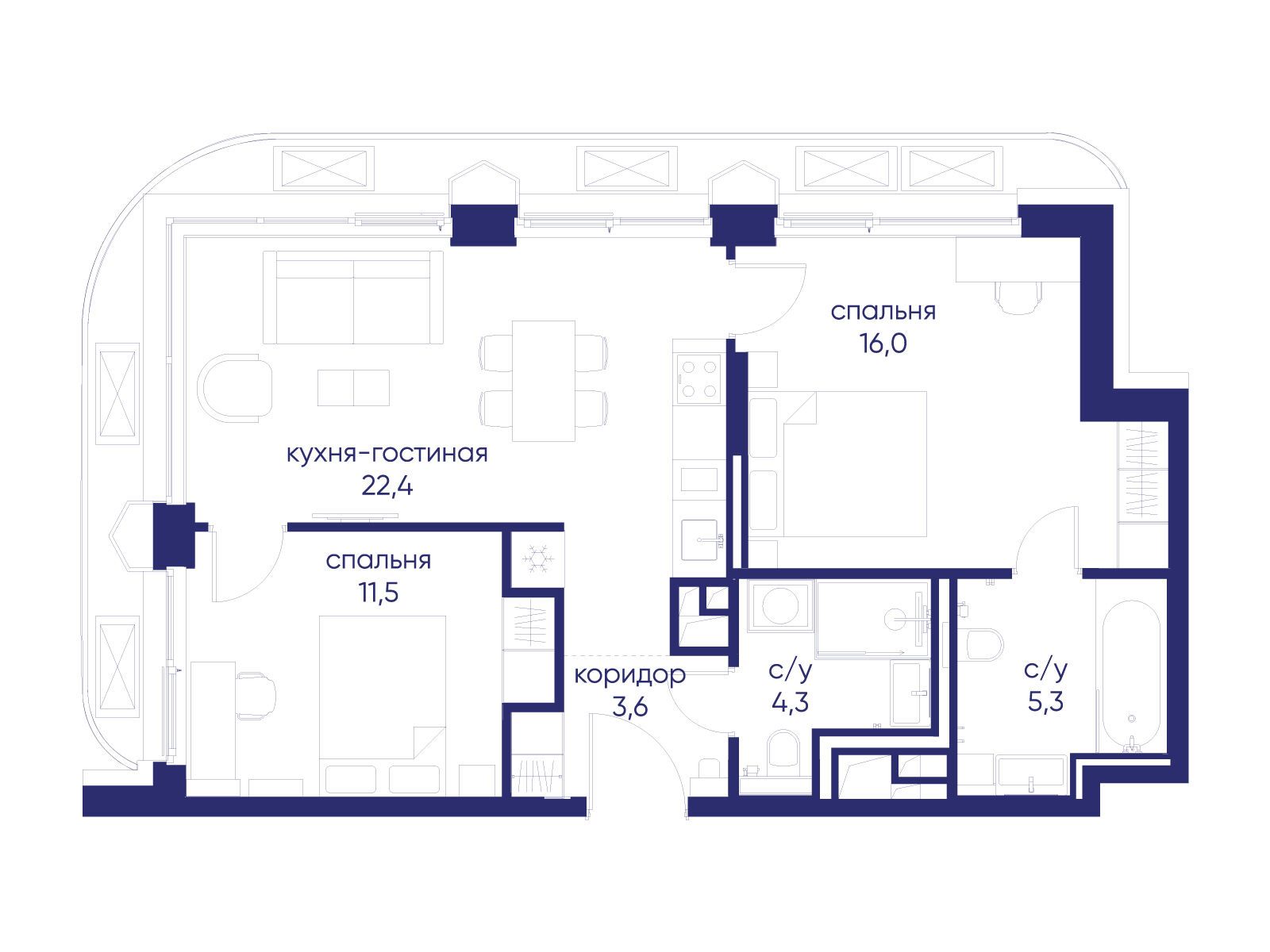 - Площадь кухни 22.4 м²