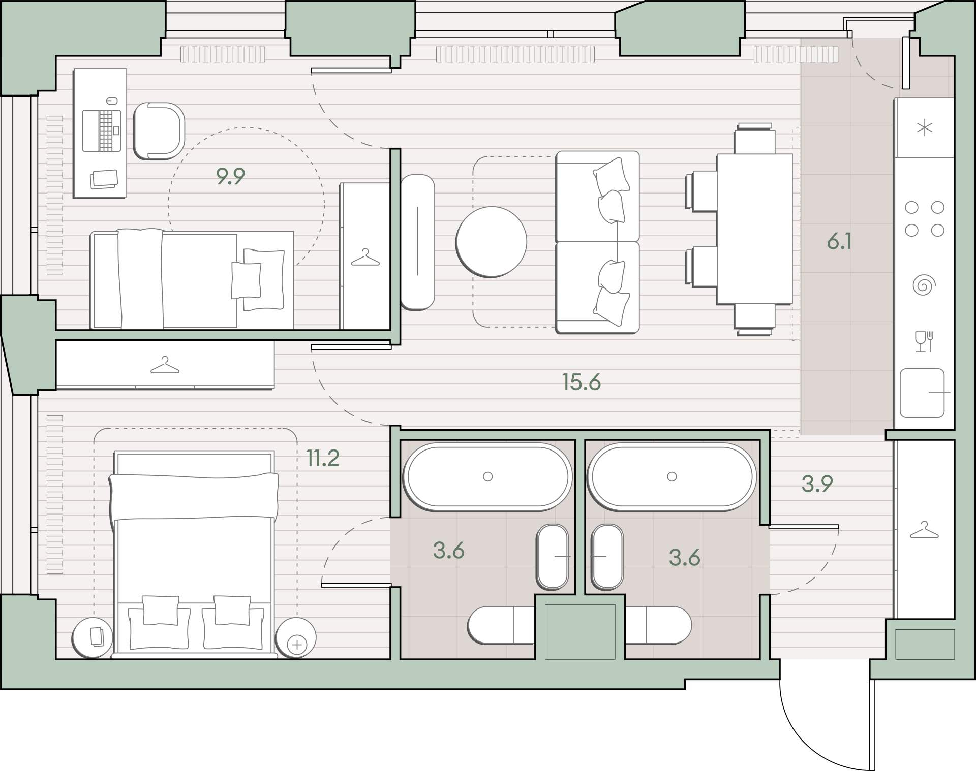 - Площадь кухни 6.1 м²