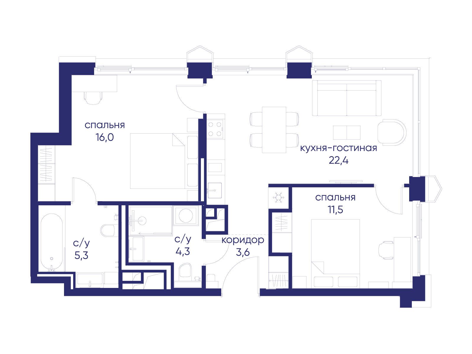 - Площадь кухни 22.4 м²