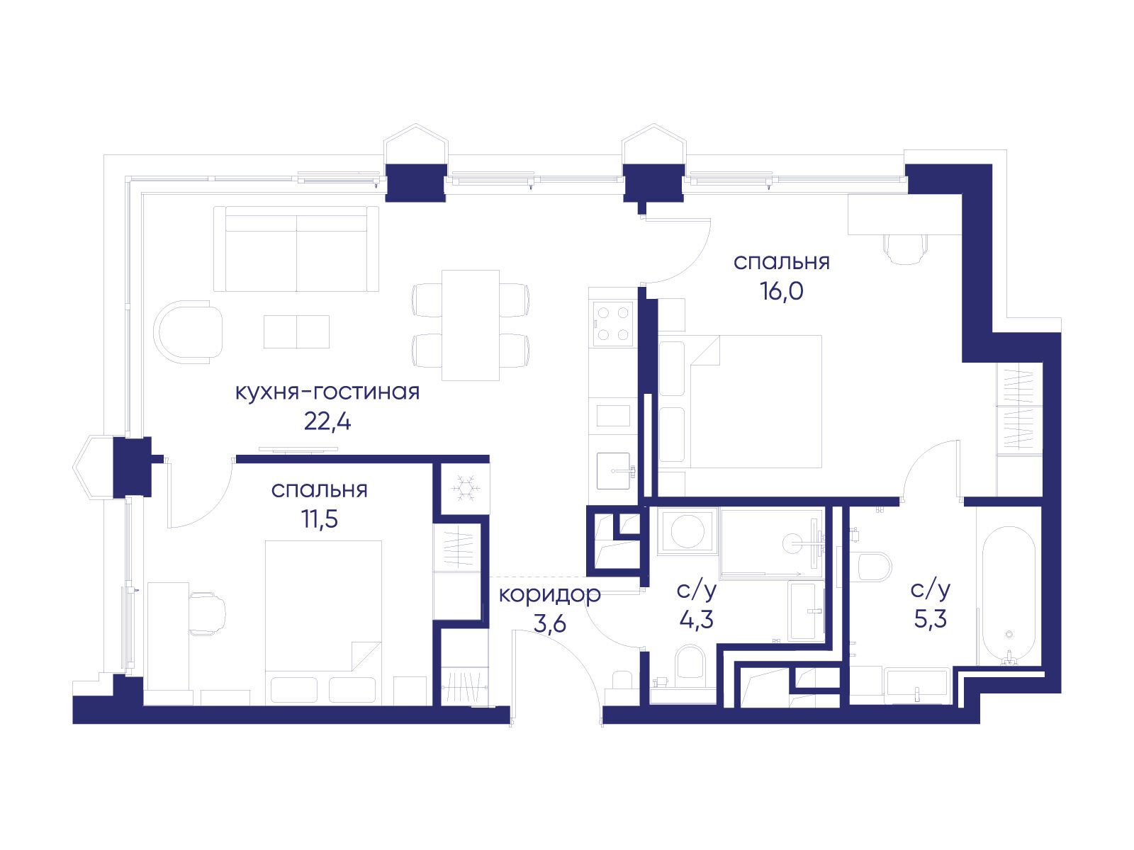 - Площадь кухни 22.4 м²