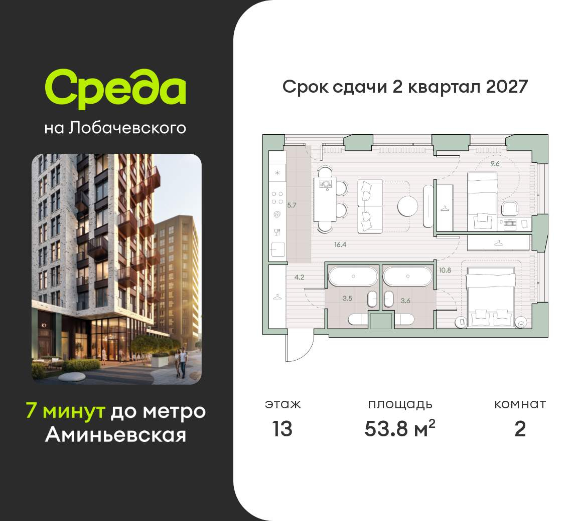 Продается 2-комн. квартира, площадью 53.8 м2 в монолитной новостройке в 12 мин. пешком от м. Аминьевская, район города - Очаково-Матвеевское. Возможен вариант покупки с использованием ипотечных средств, есть рассрочка. Жилая площадь 36.8 м2, кухня 5.7 м2, предчистовая отделка, комнаты изолированные. Квартира располагается на 13 этаже 27-этажного дома в ЖК Среда на Лобачевского. Застройщик - Среда, сдача дома - II квартал 2027 года, высота потолков 2.92 м. Дом оборудован пассажирским лифтом. Подземная парковка. Инфраструктура: детские площадки, спортивные площадки. «Среда на Лобачевского» полностью соответствует критериям современного жилого пространства. Взяв за основу рациональный подход, мы гармонично соединили дизайн, актуальные тренды и функциональность. Продуманный современный экстерьер и функциональные планировки внутри, приватные пространства и разнообразные досуговые зоны для каждого члена семьи - все это «Среда на Лобачевского». Район отлично развит и наполнен жизнью, здесь уже есть вся необходимая инфраструктура- детские сады, школы, медучреждения, торговые центры, благоустроены парки для прогулок и отдыха, удобен и легкодоступен городской транспорт. Рядом расположены учебные корпуса крупных университетов - МГУ, МГИМО и РАНХиГС. Школы и детские сады в районе занимают высокие позиции в городских рейтингах, поэтому вам не придется беспокоиться о качестве образования детей. Как и об отдыхе: поблизости расположены живописные пруды, реки и парки. Это Парк Олимпийской деревни, Парк имени 50-летия Октября, Мещерский парк и Очаковские пруды. Теперь поставить галочки в еженедельном чек-листе «спорт-прогулки-встречи с друзьями» можно, не покидая любимый район. Особое внимание в проекте уделяется созданию функциональных пространств не только внутри дома, но и за его пределами. В ландшафтном парке «Среды на Лобачевского» расположены крытые зоны для спокойного времяпровождения, места для активного отдыха и спорта, коворкинг, соседский комьюнити-центр, водные объекты. -Ландшафтный парк во дворе. -Водный сад с зонами отдыха. -Зоны коворкинга. -Дизайнерские гранд-лобби. -Бесключевой доступ. -Подземный паркинг. СПЕЦ. ПРЕДЛОЖЕНИЕ! Рассрочка с платежом 200 000 руб. /мес. Специальная программа рассрочки для покупки квартир в корпусах 5.5-5.8. Условия программы: Первый взнос: 30% Ежемесячный платеж: 200 000 рублей (фиксированный на весь срок) Срок: 18 месяцев Предложение действует на ограниченный пул квартир. Аккредитованные банки: Совкомбанк, Альфа-Банк, Банк ДОМ. РФ, Банк ВТБ, Т-Банк, МКБ Позвоните и узнайте условия покупки прямо сейчас! [#7977548#]