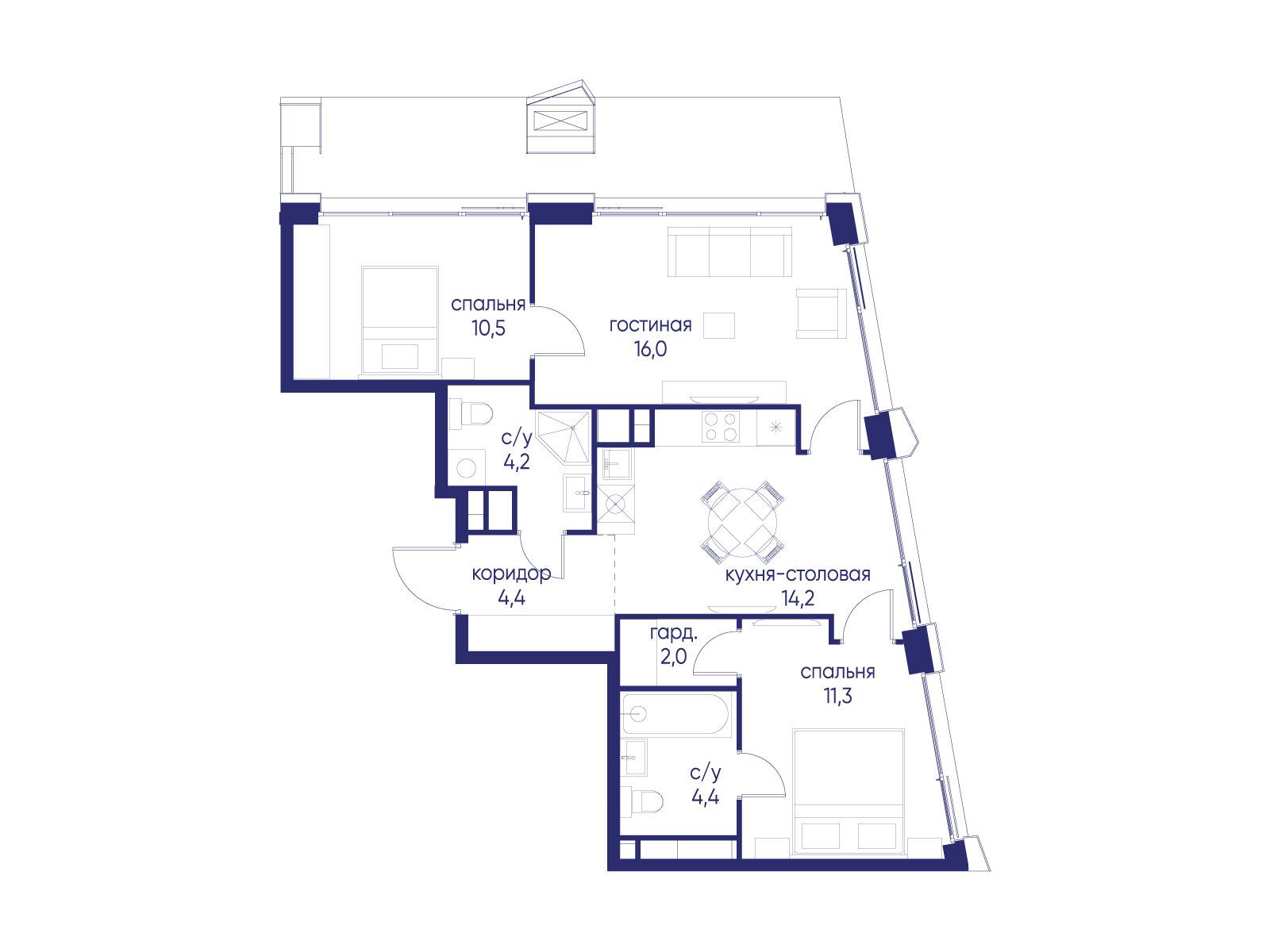 - Площадь кухни 14.2 м²