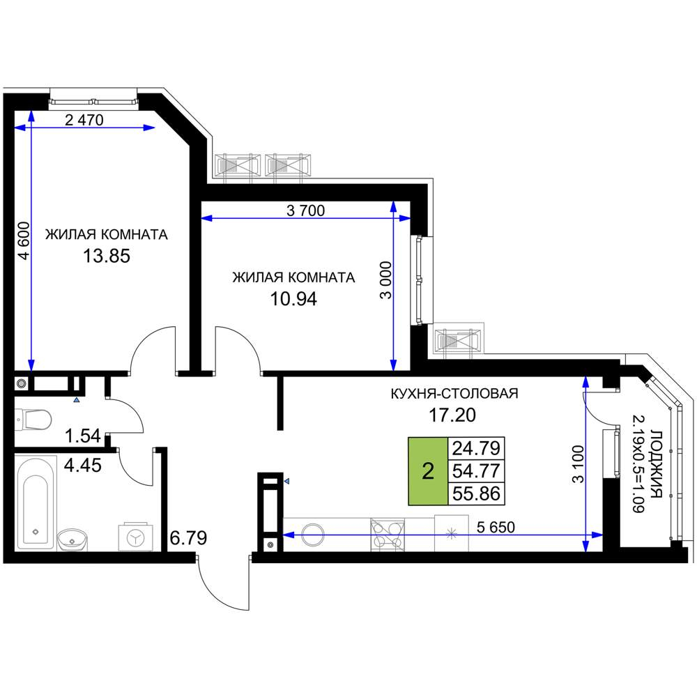 - Общая площадь 55.86 м²