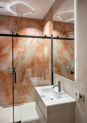 Ванная — это уже совсем иная история, драматичная и почти гипнотическая. Стена из камня с узором, напоминающим срез агата, разливается волнами терракотовых, янтарных, медных и молочно-белых оттенков. Этот природный хаос уравновешен минимализмом формы: гладкая белая ванна, строгие линии, тёплый золотой металл смесителя. Здесь цвет становится главным героем — густым, текучим, почти живым, как застывшее пламя