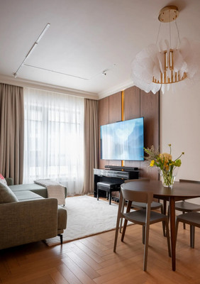 В 23 этажном корпусе на 2 этаже находится квартира словно написанная мягкой акварелью, где каждая комната — отдельный штрих в единой, гармоничной композиции. Гостиная-кухня встречает спокойной палитрой теплых нейтралов: сливочно-бежевые фасады, молочно-белые стены и приглушённый оттенок светлого дерева пола создают ощущение воздуха и тишины. В центре гостинной круглый стол в серо-графитовом тоне, как якорь композиции, а над ним парит светильник, похожий на облако из перламутровых лепестков, переливающихся мягким золотом