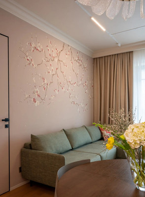 Спальня же звучит мягко и приглушённо, как вечерний свет. Пудрово-розовые и карамельно-персиковые оттенки текстиля обволакивают пространство теплом. Стена с цветущими ветвями в нежных кремовых и бежевых тонах добавляет поэтичности — словно весна застыла на мгновение. Лёгкие полупрозрачные шторы рассеивают дневной свет, превращая его в мягкое сияние,. Вся квартира — это диалог между светом и текстурой, между теплом землистых оттенков и чистотой светлых поверхностей. Здесь нет резких контрастов, только плавные переходы, как в природе: от песка к камню, от рассвета к закату
