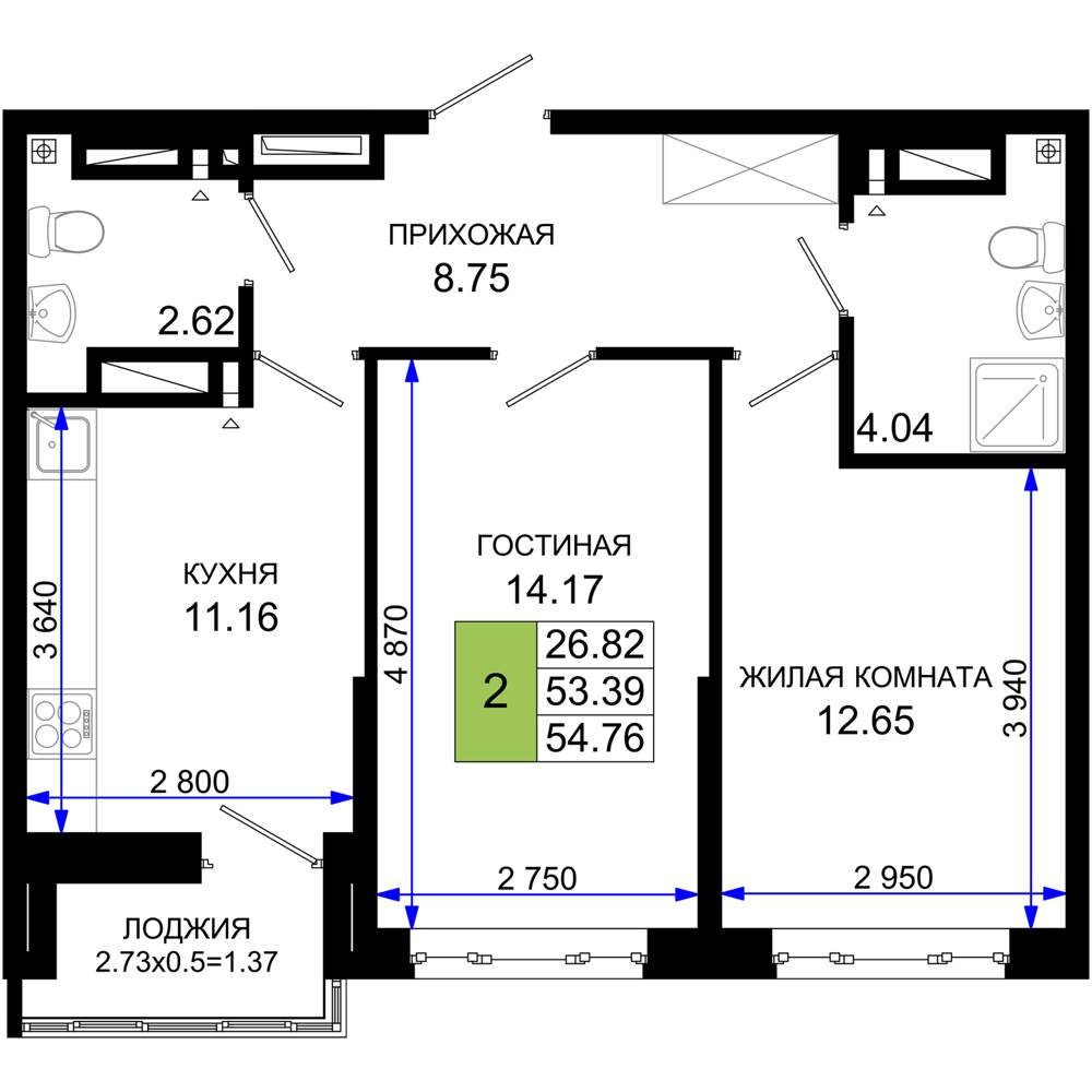 - Общая площадь 54.76 м²