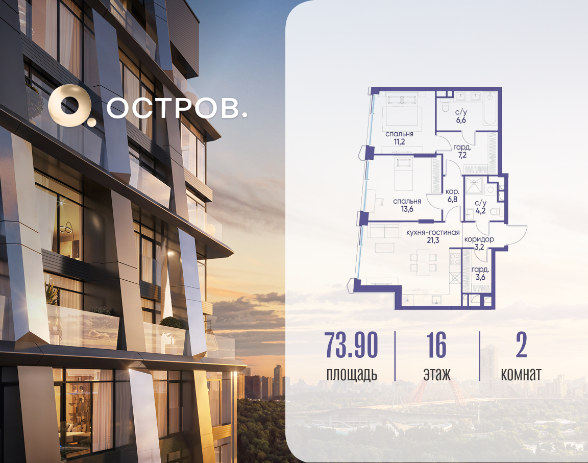 Продаётся двухкомнатная квартира от застройщика: общая площадь 73.92 м², жилая 24.80 м², кухня 21.30 м², 16, жилой квартал «Остров 12», корпус 3 (12.1 квартал) (секция 1). срок сдачи: 4-кв. 2025. , 2 санузла: 2 совмещенных. В жилой зоне 2 больших окна на одну сторону, хорошая инсоляция. Позвоните сейчас и забронируйте квартиру! Купите квартиру для курортной жизни в Москве в квартале ОСТРОВ.12.1. Это единственный на ОСТРОВЕ квартал бизнес-класса, расположенный на первой линии у реки - здесь царит атмосфера ежедневного отпуска. Дома созданы в узнаваемом футуристичном стиле и выглядят как произведения современного искусства. Для жителей предусмотрены фитнес-рум и детский клуб, гостиная и кинотеатр, переговорные и репетиторские комнаты. На крышах устроены видовые общественные пространства с зонами для йоги, коворкингами, лаунжами. Двор-парк располагает всем необходимым для отдыха и общения всех возрастов. ОСТРОВ.12.1 - часть жилого комплекса на западе Москвы, в 15 минутах езды от центра. Это настоящий заповедник посреди большого города, в окружении реки и 650 га заповедников. Здесь все необходимое находится по соседству: от детского сада до супермаркета, от фитнес-зала до серфинг-центра. На территории созданы все условия для отдыха и общения: клубная инфраструктура в домах и дворы-парки, набережные и променады, маршруты для спортсменов, детей и возрастных жителей. В нескольких минутах ходьбы расположена станция метро "Мнёвники" БКЛ. На автомобиле - 10 минут до Москва-Сити и 15 минут до Садового кольца.