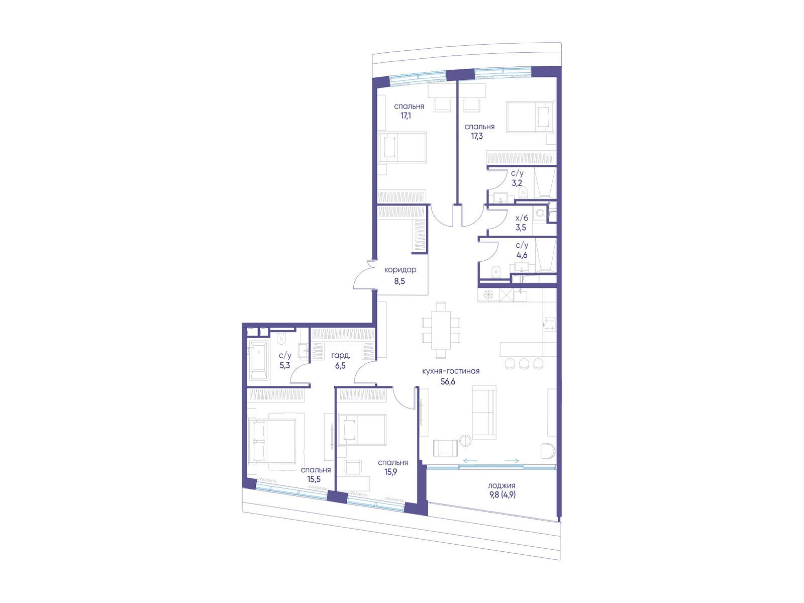 - Площадь кухни 56.6 м²