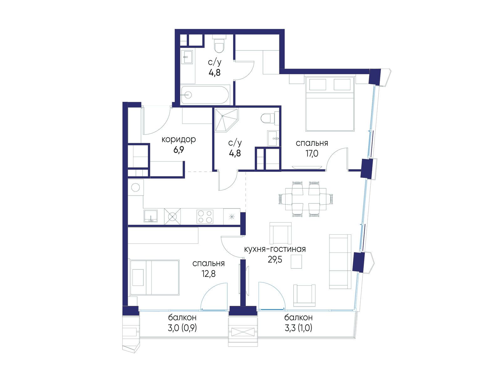• Площадь кухни 29.5 м²