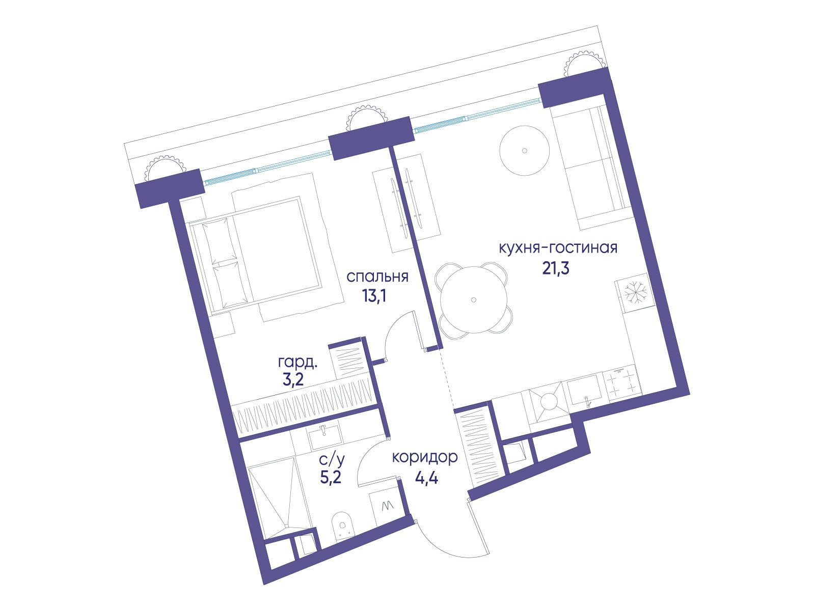 - Жилая площадь 13.1 м²
