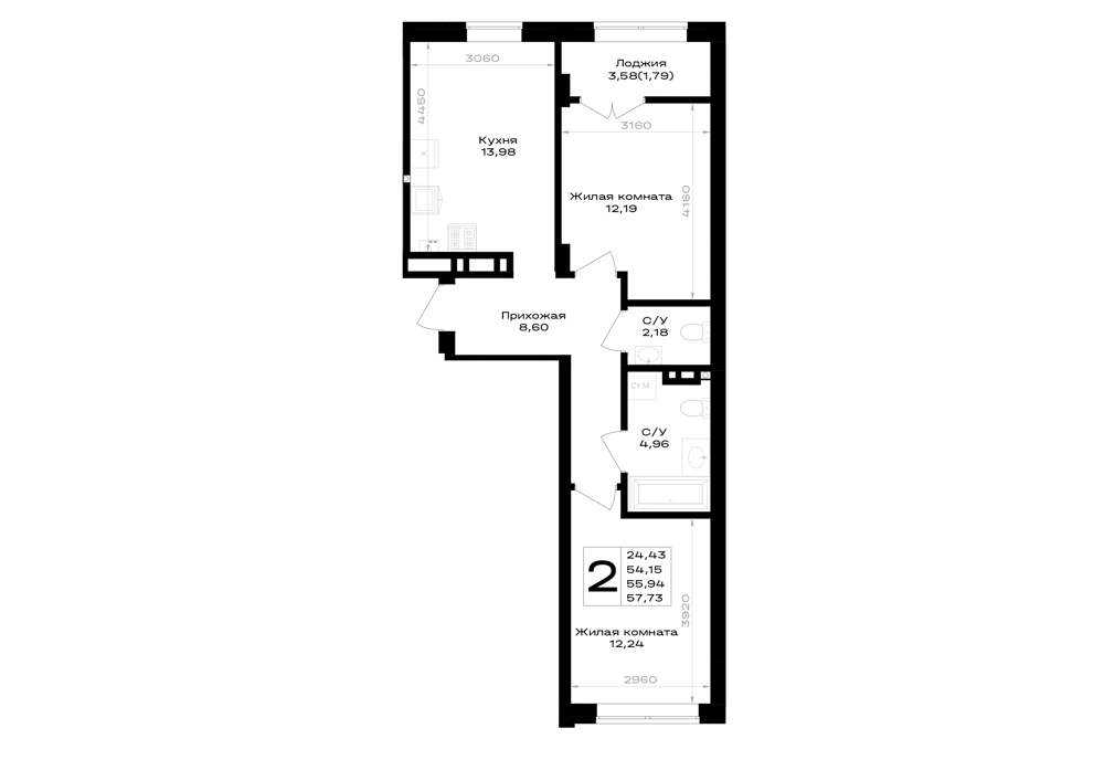 - Общая площадь 55.94 м²